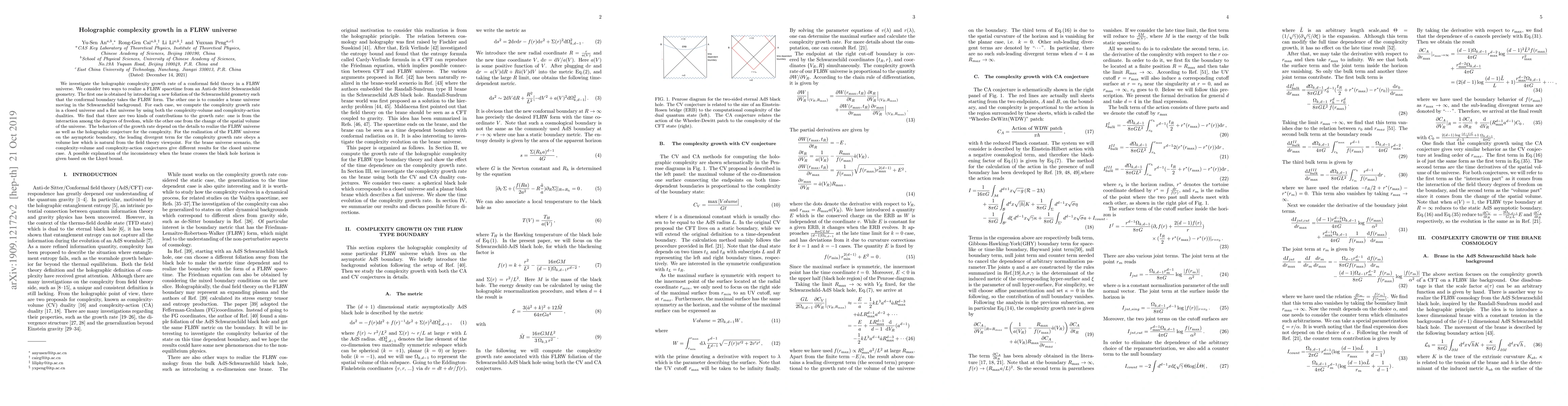 This paper explores the holographic complexity growth rate in a FLRW universe through two distinct realizations: one via a new foliation of Schwarzschild geometry and another considering a brane universe in a Schwarzschild background. It finds two contributions to the growth rate: one from interactions and another from spatial volume changes, with differing results depending on the realization and the complexity conjecture used.