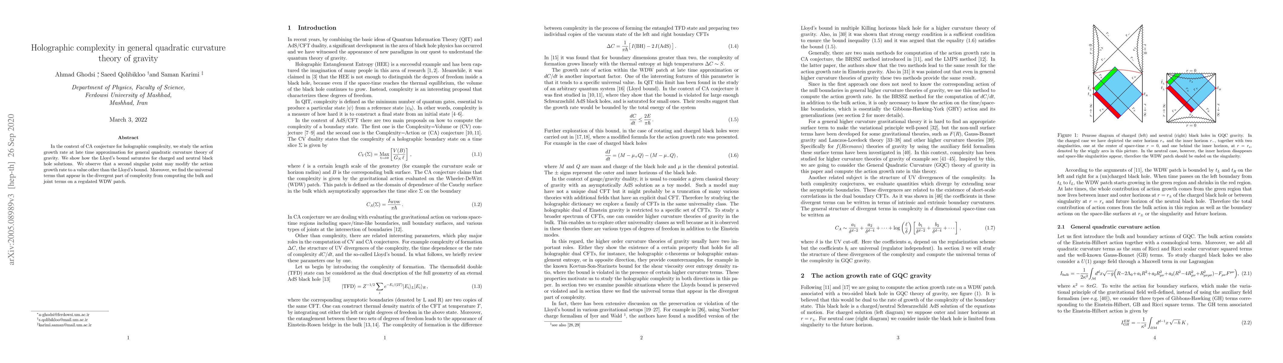 This paper investigates holographic complexity in general quadratic curvature gravity, demonstrating that Lloyd's bound saturates for both charged and neutral black hole solutions. It also identifies a second singular point that can alter the action growth rate, and reveals universal terms in the divergent complexity from regulated WDW patch computations.
