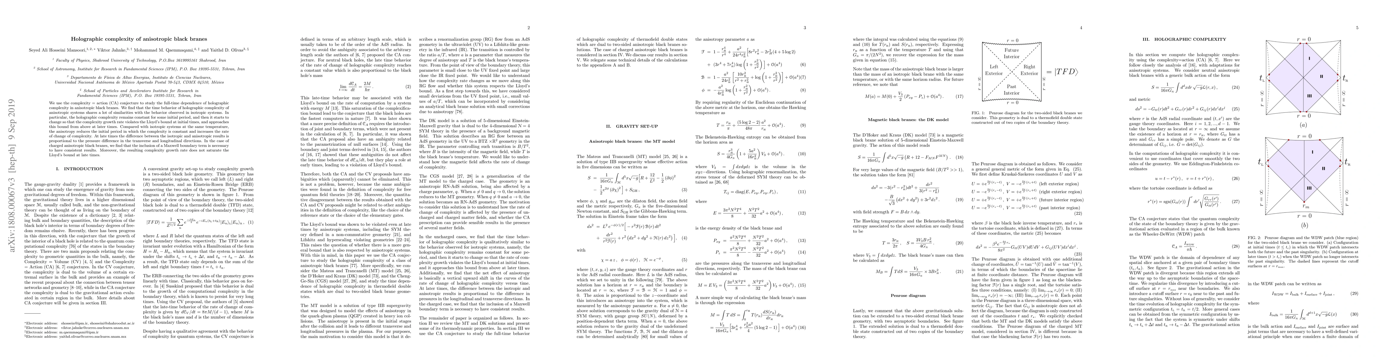 We use the complexity = action (CA) conjecture to study the full-time dependence of holographic complexity in anisotropic black branes. We find that the time behaviour of holographic complexity of anisotropic systems shares a lot of similarities with the behaviour observed in isotropic systems. In particular, the holographic complexity remains constant for some initial period, and then it starts to change so that the complexity growth rate violates the Lloyd's bound at initial times, and approaches this bound from above at later times. Compared with isotropic systems at the same temperature, the anisotropy reduces the initial period in which the complexity is constant and increases the rate of change of complexity. At late times the difference between the isotropic and anisotropic results is proportional to the pressure difference in the transverse and longitudinal directions.
