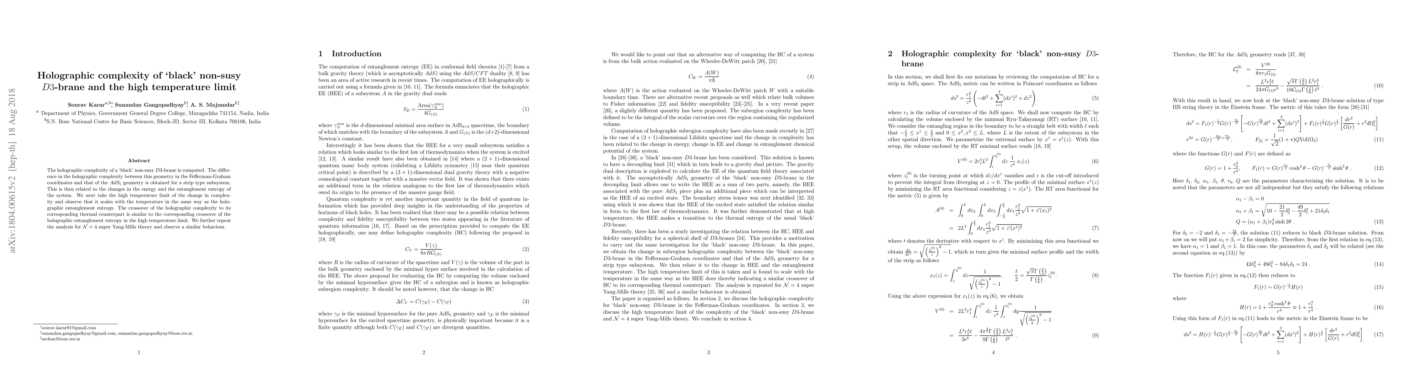 This paper computes the holographic complexity of a non-susy D3-brane black geometry and finds it relates to energy and entanglement entropy changes. In the high temperature limit, the complexity scales similarly to holographic entanglement entropy, showing a thermal crossover behavior akin to that of entanglement entropy.