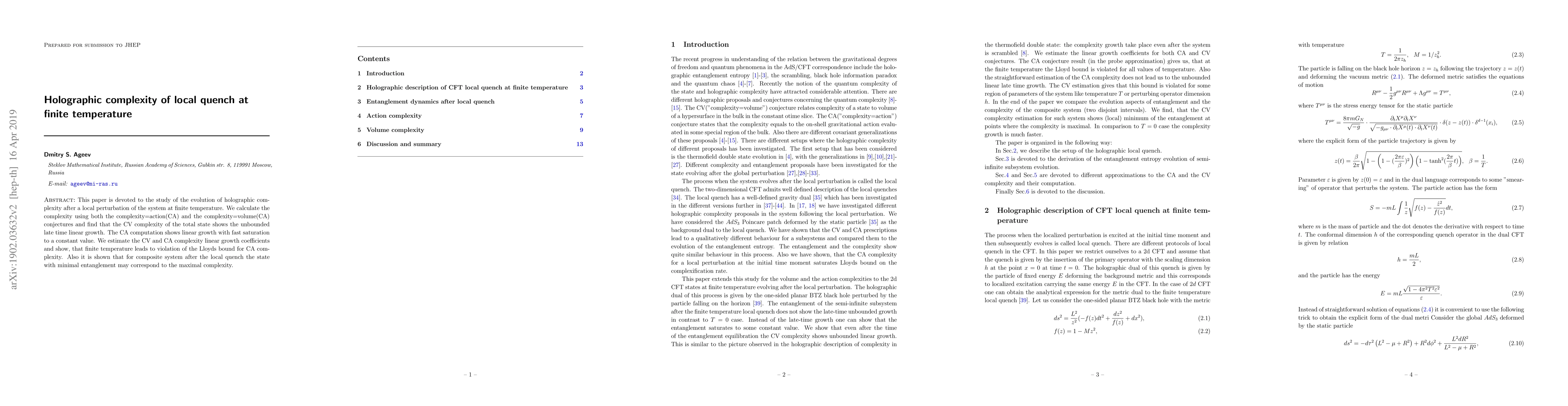 This paper is devoted to the study of the evolution of holographic complexity after a local perturbation of the system at finite temperature. We calculate the complexity using both the complexity=action(CA) and the complexity=volume(CA) conjectures and find that the CV complexity of the total state shows the unbounded late time linear growth. The CA computation shows linear growth with fast saturation to a constant value. We estimate the CV and CA complexity linear growth coefficients and show, that finite temperature leads to violation of the Lloyd bound for CA complexity. Also it is shown that for composite system after the local quench the state with minimal entanglement may correspond to the maximal complexity.