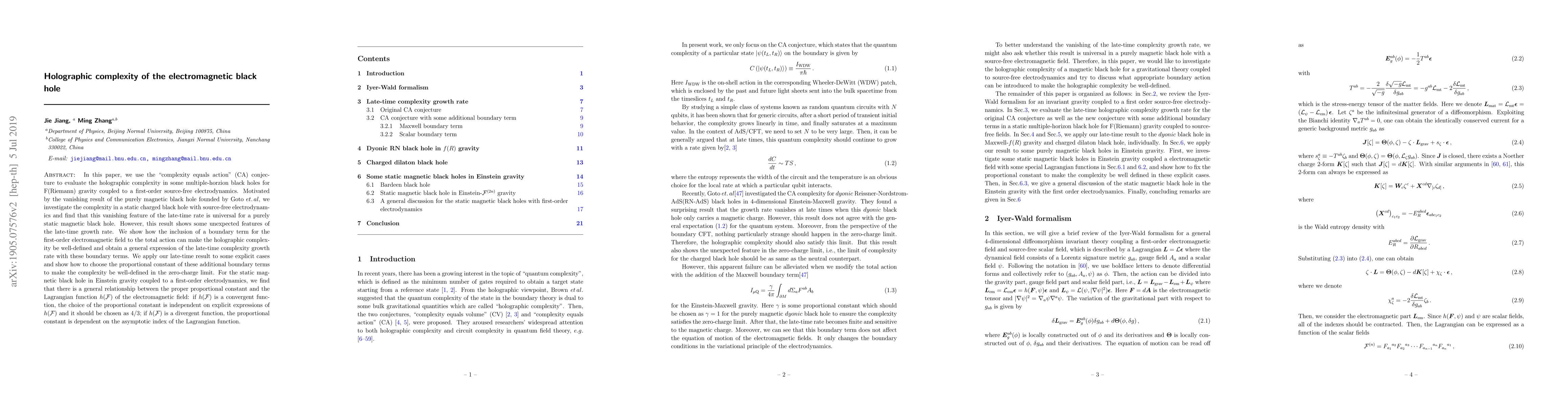 In this paper, we use the "complexity equals action" (CA) conjecture to evaluate the holographic complexity in some multiple-horzion black holes for F(Riemann) gravity coupled to a first-order source-free electrodynamics. Motivated by the vanishing result of the purely magnetic black hole founded by Goto $et.\, al$, we investigate the complexity in a static charged black hole with source-free electrodynamics and find that this vanishing feature of the late-time rate is universal for a purely static magnetic black hole. However, this result shows some unexpected features of the late-time growth rate. We show how the inclusion of a boundary term for the first-order electromagnetic field to the total action can make the holographic complexity be well-defined and obtain a general expression of the late-time complexity growth rate with these boundary terms. We apply our late-time result to some explicit cases and show how to choose the proportional constant of these additional boundary terms to make the complexity be well-defined in the zero-charge limit. For the static magnetic black hole in Einstein gravity coupled to a first-order electrodynamics, we find that there is a general relationship between the proper proportional constant and the Lagrangian function $h(\math{F})$ of the electromagnetic field: if $h(\math{F})$ is a convergent function, the choice of the proportional constant is independent on explicit expressions of $h(\math{F})$ and it should be chosen as $4/3$; if $h(\math{F})$ is a divergent function, the proportional constant is dependent on the asymptotic index of the Lagrangian function.