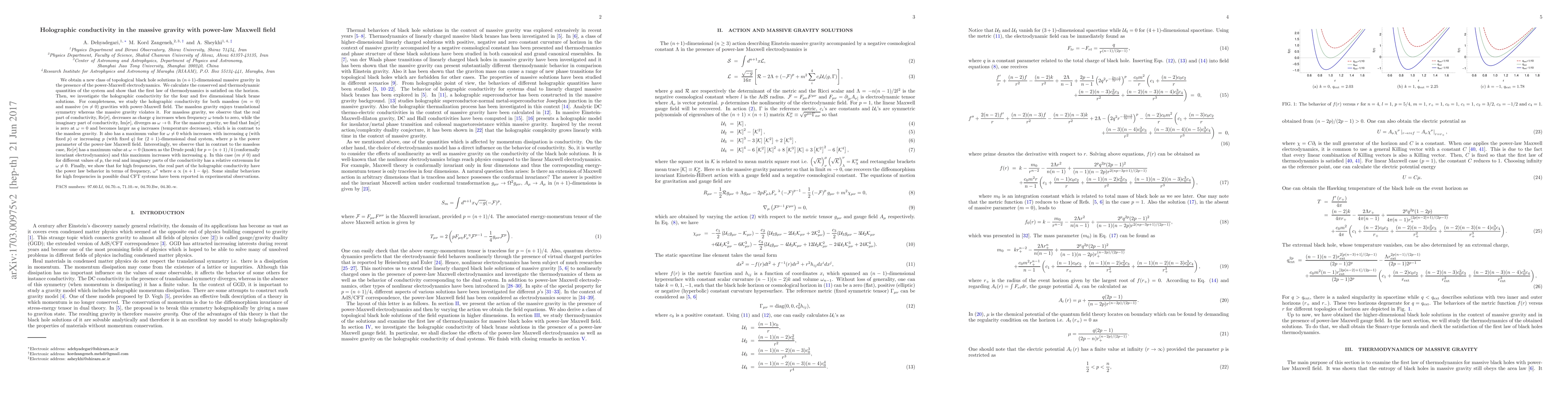This paper explores topological black hole solutions in massive gravity with power-law Maxwell field, calculating thermodynamic quantities and holographic conductivity. It finds distinct behaviors in holographic conductivity for massless and massive gravity, including the emergence of a Drude peak in the latter.