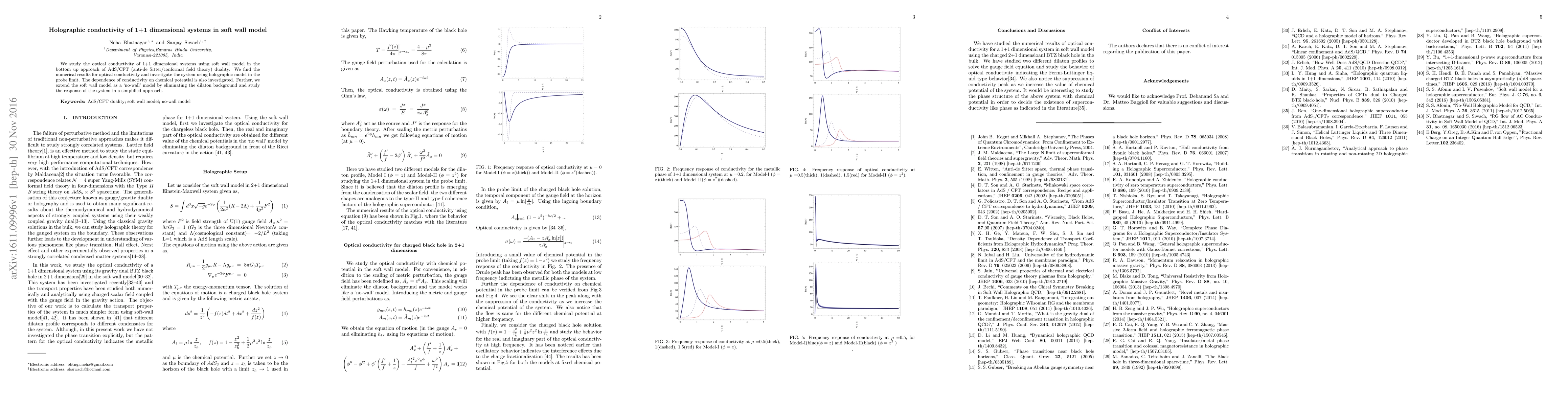 We study the optical conductivity of 1+1 dimensional systems using soft wall model in the bottom up approach of AdS/CFT (anti-de Sitter/conformal field theory) duality. We find the numerical results for optical conductivity and investigate the system using holographic model in the probe limit. The dependence of conductivity on chemical potential is also investigated. Further, we extend the soft wall model as a `no-wall' model by eliminating the dilaton background and study the response of the system in a simplified approach.