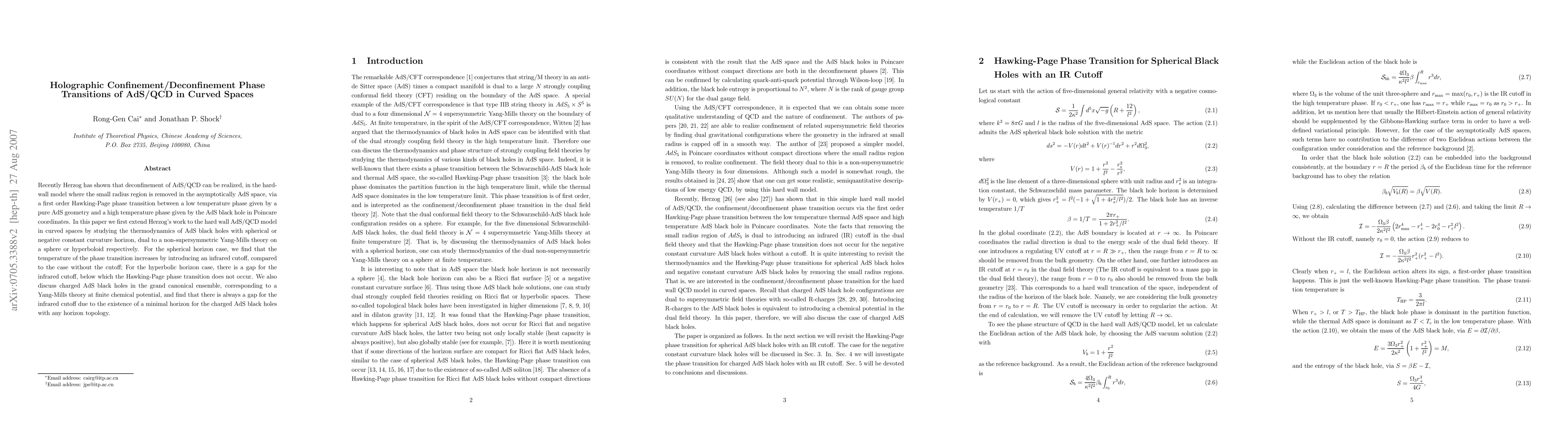 Recently Herzog has shown that deconfinement of AdS/QCD can be realized, in the hard-wall model where the small radius region is removed in the asymptotically AdS space, via a first order Hawking-Page phase transition between a low temperature phase given by a pure AdS geometry and a high temperature phase given by the AdS black hole in Poincare coordinates. In this paper we first extend Herzog's work to the hard wall AdS/QCD model in curved spaces by studying the thermodynamics of AdS black holes with spherical or negative constant curvature horizon, dual to a non-supersymmetric Yang-Mills theory on a sphere or hyperboloid respectively. For the spherical horizon case, we find that the temperature of the phase transition increases by introducing an infrared cutoff, compared to the case without the cutoff; For the hyperbolic horizon case, there is a gap for the infrared cutoff, below which the Hawking-Page phase transition does not occur. We also discuss charged AdS black holes in the grand canonical ensemble, corresponding to a Yang-Mills theory at finite chemical potential, and find that there is always a gap for the infrared cutoff due to the existence of a minimal horizon for the charged AdS black holes with any horizon topology.