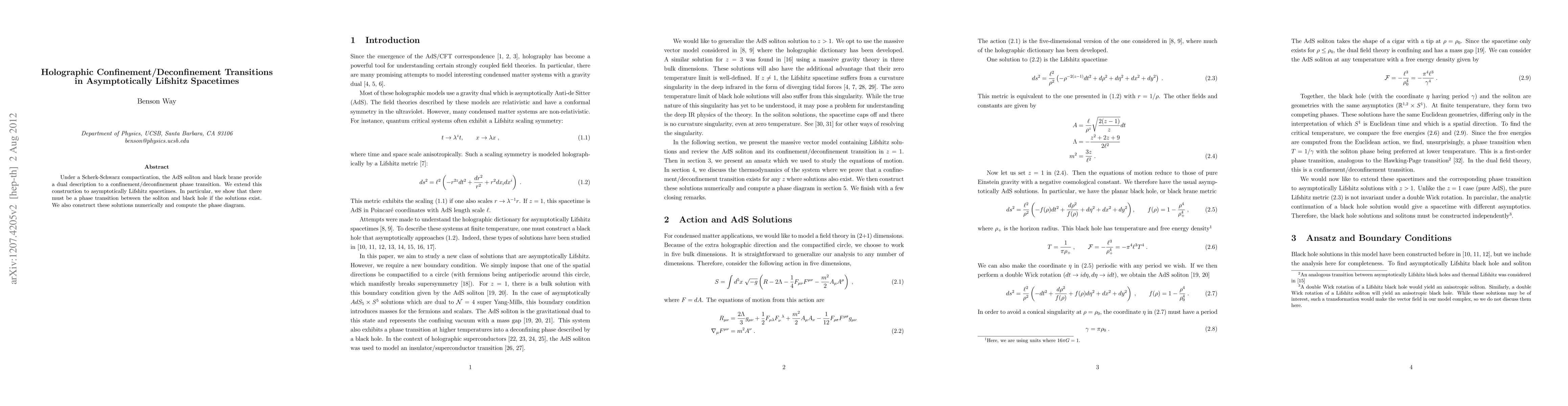 This paper explores holographic confinement/deconfinement transitions in asymptotically Lifshitz spacetimes, extending the AdS soliton and black brane duality to these settings. The authors numerically construct solutions and determine the phase diagram, revealing a necessary phase transition between soliton and black hole configurations.