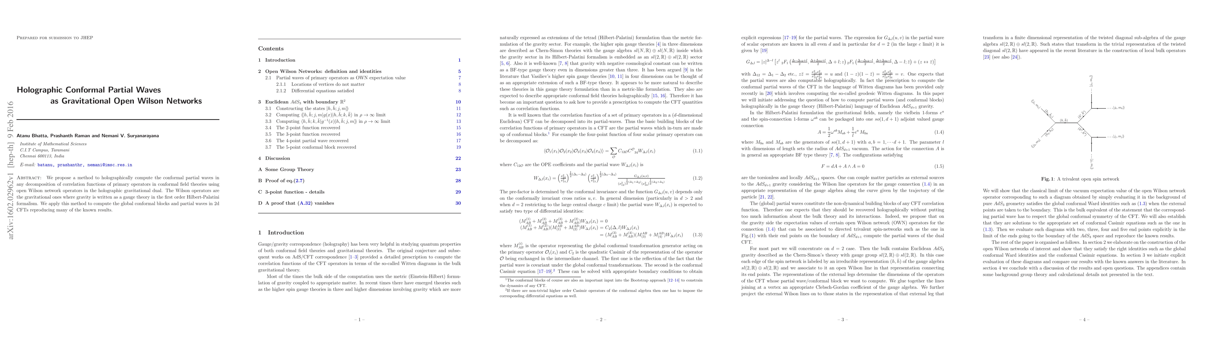 We propose a method to holographically compute the conformal partial waves in any decomposition of correlation functions of primary operators in conformal field theories using open Wilson network operators in the holographic gravitational dual. The Wilson operators are the gravitational ones where gravity is written as a gauge theory in the first order Hilbert-Palatini formalism. We apply this method to compute the global conformal blocks and partial waves in 2d CFTs reproducing many of the known results.