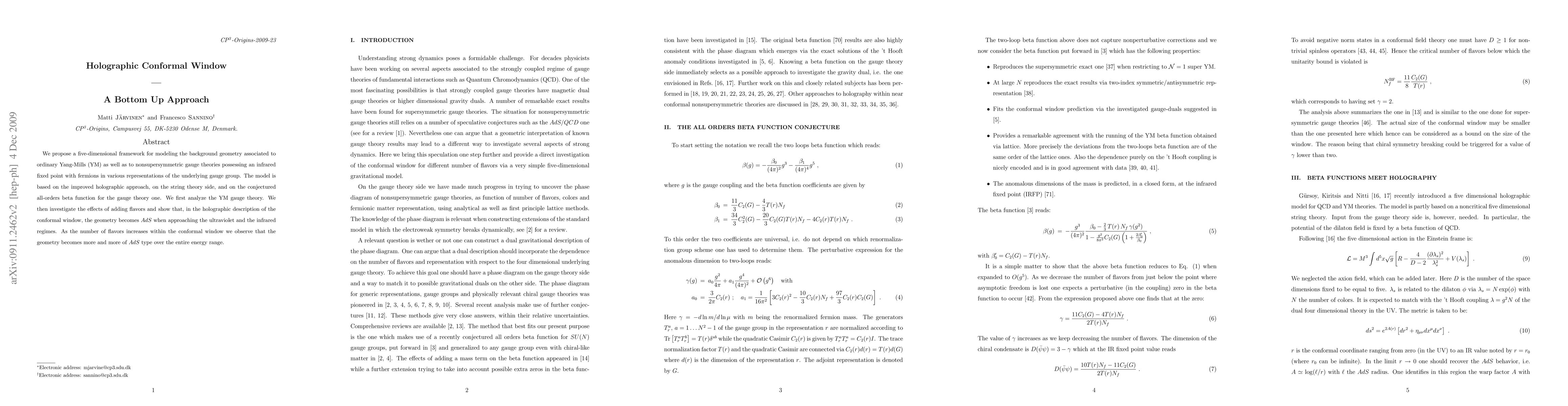 We propose a five-dimensional framework for modeling the background geometry associated to ordinary Yang-Mills (YM) as well as to nonsupersymmetric gauge theories possessing an infrared fixed point with fermions in various representations of the underlying gauge group. The model is based on the improved holographic approach, on the string theory side, and on the conjectured all-orders beta function for the gauge theory one. We first analyze the YM gauge theory. We then investigate the effects of adding flavors and show that, in the holographic description of the conformal window, the geometry becomes AdS when approaching the ultraviolet and the infrared regimes. As the number of flavors increases within the conformal window we observe that the geometry becomes more and more of AdS type over the entire energy range.
