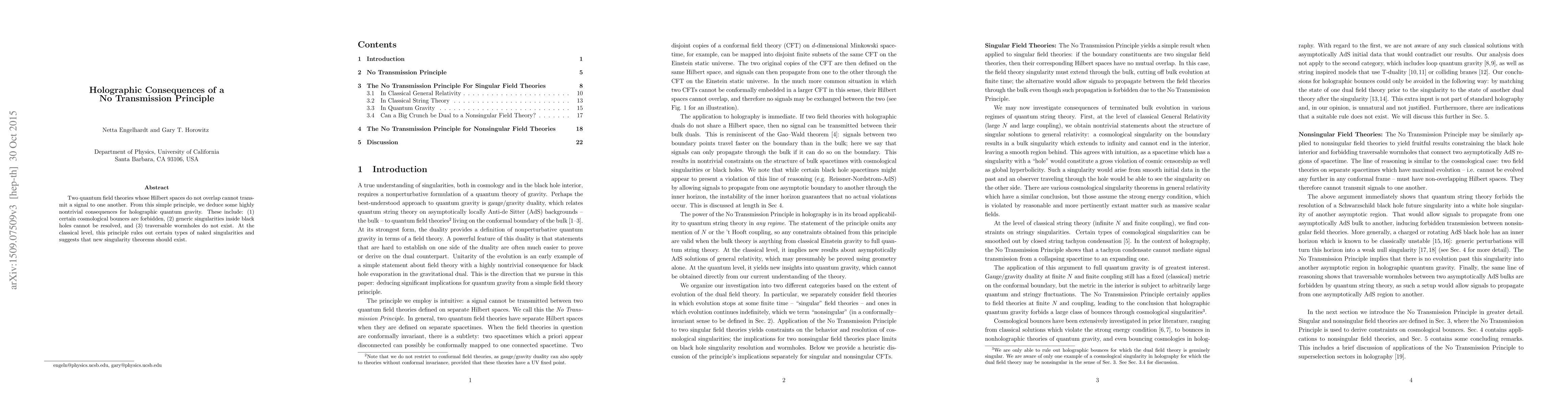 This paper explores the implications of a no transmission principle between non-overlapping quantum field theories, revealing significant consequences for holographic quantum gravity, including the prohibition of certain cosmological bounces, the irresolvability of generic singularities inside black holes, and the nonexistence of traversable wormholes. Classically, it rules out specific naked singularities and hints at new singularity theorems.
