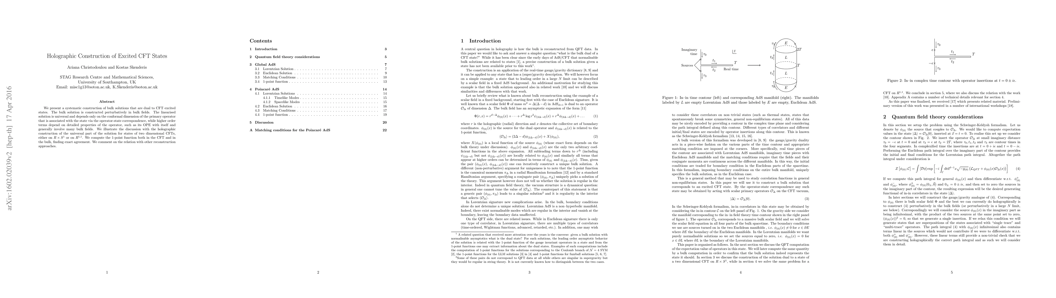 Researchers developed a method to create holographic versions of excited states in conformal field theories (CFTs), finding exact agreement between the CFT and bulk 1-point functions.