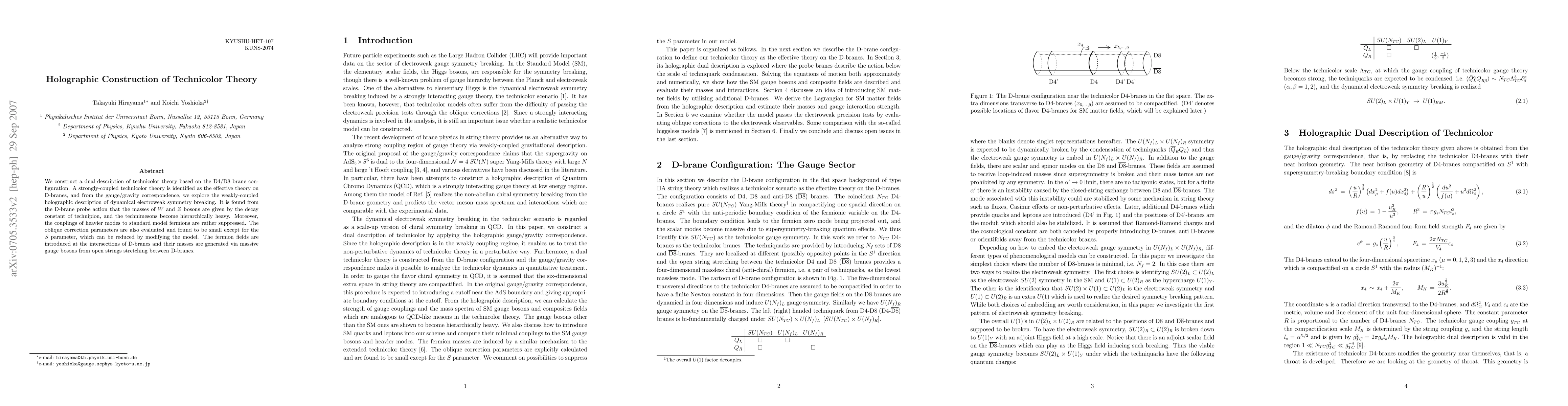This paper constructs a holographic dual description of technicolor theory using D4/D8 brane configurations, identifying a strongly-coupled technicolor theory on D-branes. The gauge/gravity correspondence provides a weakly-coupled holographic view of electroweak symmetry breaking, with the W and Z boson masses linked to the technipion decay constant.