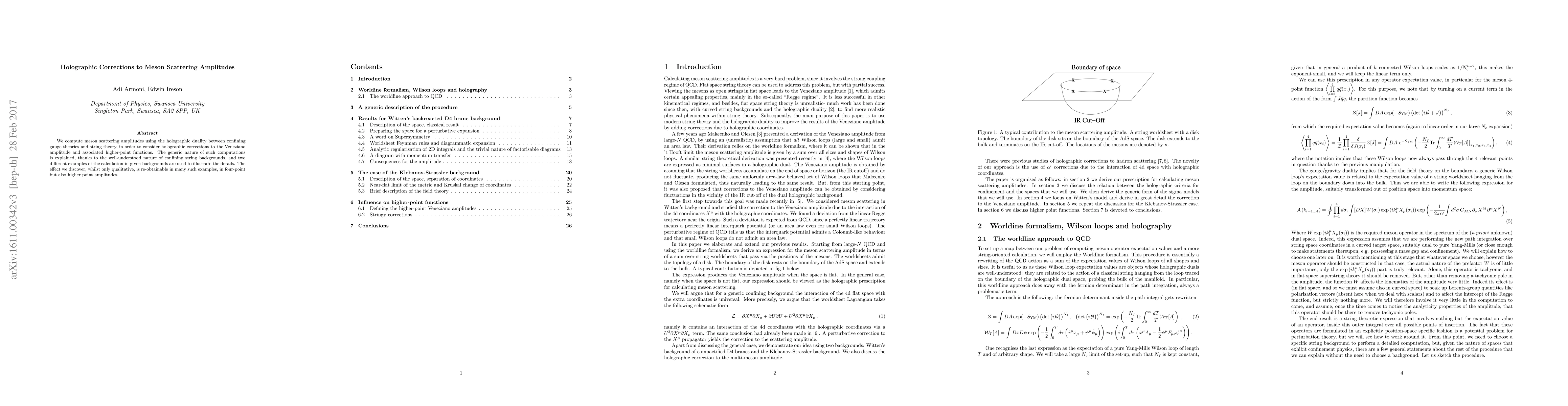 This paper computes meson scattering amplitudes via holographic duality, revealing qualitative holographic corrections to the Veneziano amplitude and higher-point functions. The study uses well-understood string backgrounds to illustrate the generic nature of these computations.