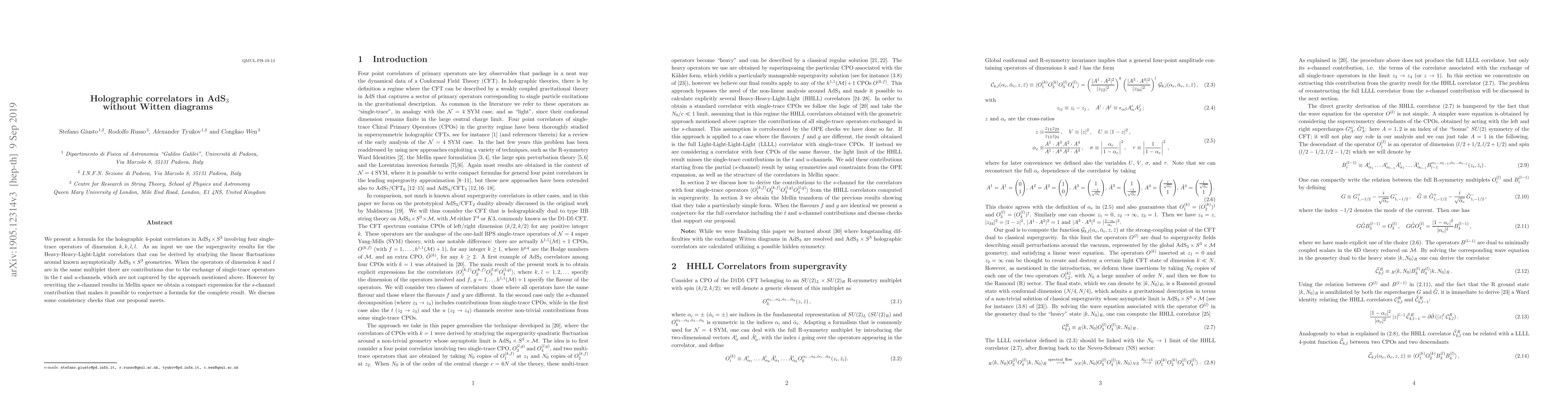 This paper proposes a formula for holographic 4-point correlators in AdS$_3$ using supergravity results, addressing contributions from the $s$-channel via Mellin space transformation and verifying consistency. The formula aims to compute correlators for four single-trace operators in AdS$_3 \times S^3$.