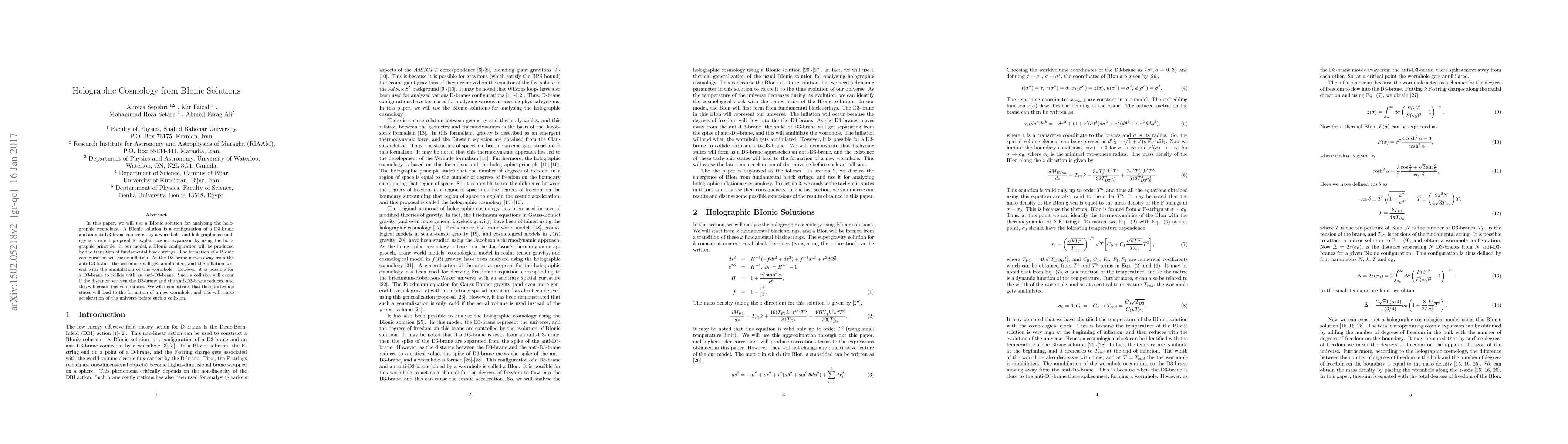 This paper explores holographic cosmology through BIonic solutions, which involve D3-brane and anti-D3-brane configurations. It demonstrates that BIonic configurations, formed by transitioning black strings, induce inflation, ending when the wormhole annihilates, but potential collisions may create new wormholes, accelerating the universe.