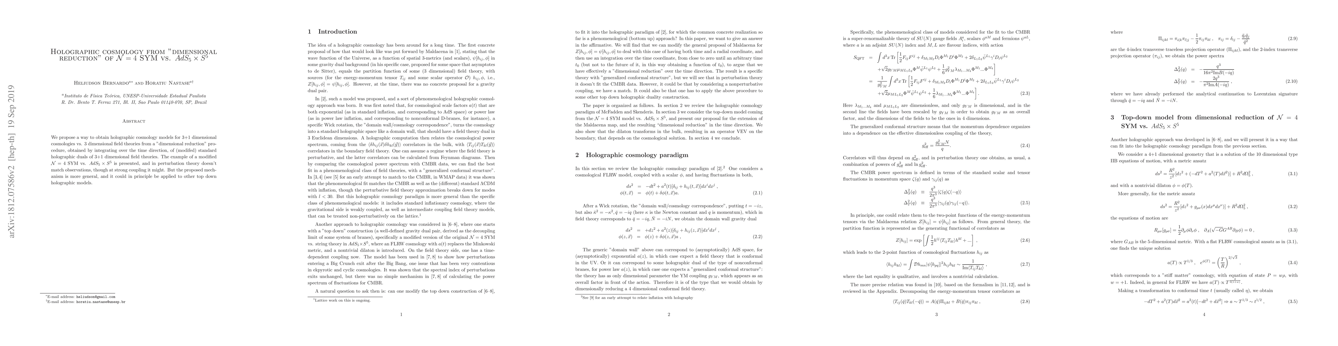 This paper proposes a method to derive holographic cosmology models from "dimensional reduction" of ${\cal N}=4$ SYM, mapping 3+1 dimensional cosmologies to 3 dimensional field theories. While the specific example does not match observational data in perturbation theory, it suggests a more general approach that could be applied to other top-down holographic models at strong coupling.