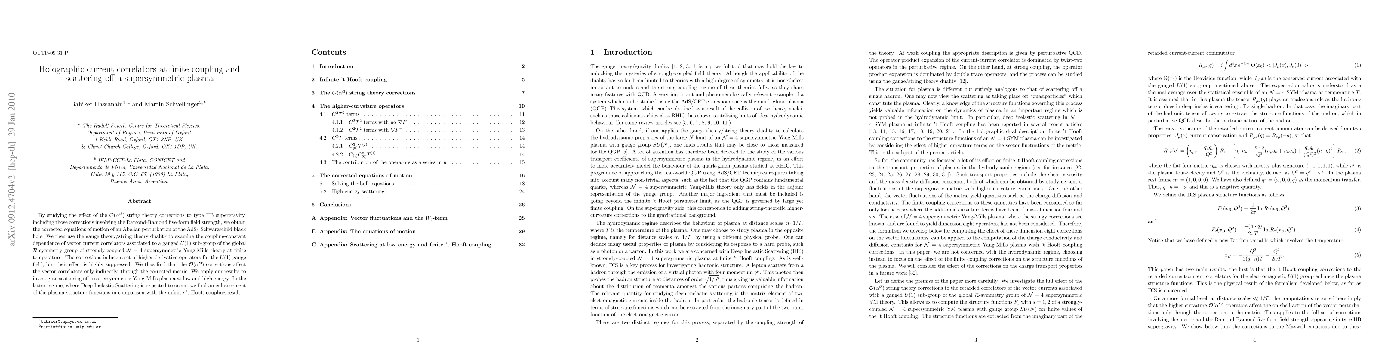 By studying the effect of the order(\alpha'^3) string theory corrections to type IIB supergravity, including those corrections involving the Ramond-Ramond five-form field strength, we obtain the corrected equations of motion of an Abelian perturbation of the AdS_5-Schwarzschild black hole. We then use the gauge theory/string theory duality to examine the coupling-constant dependence of vector current correlators associated to a gauged U(1) sub-group of the global R-symmetry group of strongly-coupled N=4 supersymmetric Yang-Mills theory at finite temperature. The corrections induce a set of higher-derivative operators for the U(1) gauge field, but their effect is highly suppressed. We thus find that the order(\alpha'^3) corrections affect the vector correlators only indirectly, through the corrected metric. We apply our results to investigate scattering off a supersymmetric Yang-Mills plasma at low and high energy. In the latter regime, where Deep Inelastic Scattering is expected to occur, we find an enhancement of the plasma structure functions in comparison with the infinite 't Hooft coupling result.