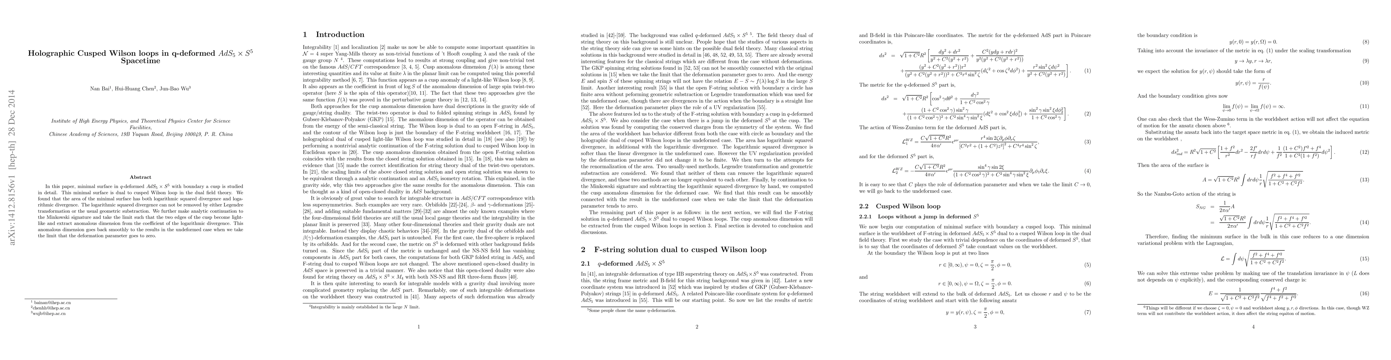 In this paper, minimal surface in $q$-deformed $AdS_5\times S^5$ with boundary a cusp is studied in detail. This minimal surface is dual to cusped Wilson loop in the dual field theory. We found that the area of the minimal surface has both logarithmic squared divergence and logarithmic divergence. The logarithmic squared divergence can not be removed by either Legendre transformation or the usual geometric substraction. We further make analytic continuation to the Minkowski signature %for the case without the jump and take the limit such that the two edges of the cusp become light-like and extract anomalous dimension from the coefficient of the logarithmic divergence. This anomalous dimension goes back smoothly to the results in the undeformed case when we take the limit that the deformation parameter goes to zero.