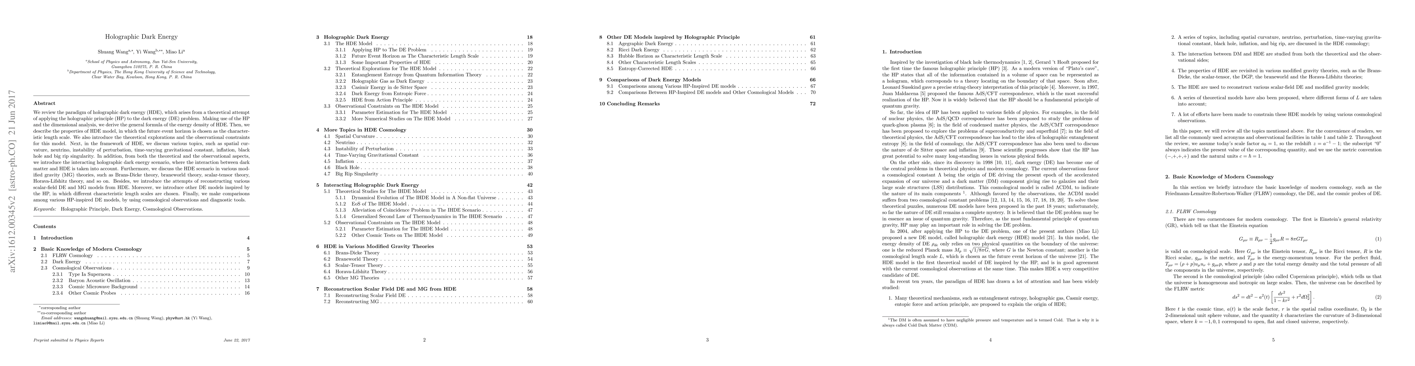 The paper reviews the holographic dark energy (HDE) paradigm, applying the holographic principle (HP) to the dark energy (DE) problem, deriving the general formula for HDE energy density, and exploring various topics such as spatial curvature, neutrino, instability of perturbation, time-varying gravitational constant, inflation, black hole, and big rip singularity.