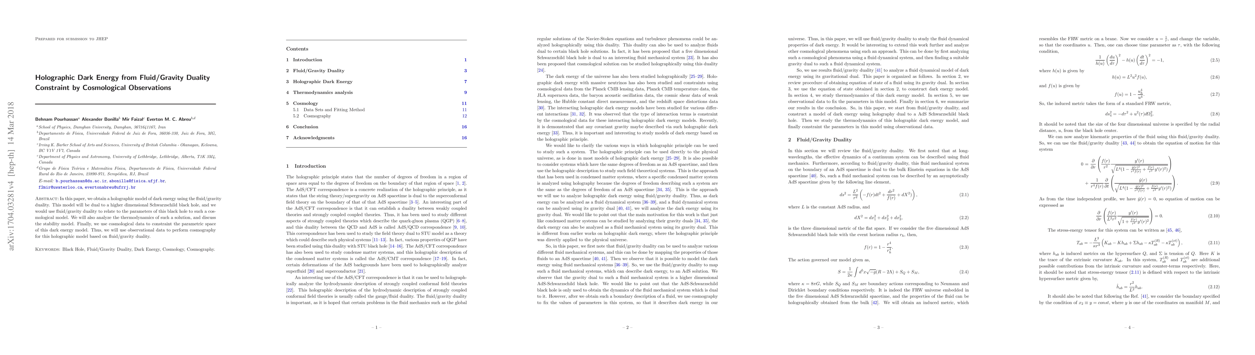 This paper develops a holographic dark energy model using fluid/gravity duality, relating it to a higher-dimensional Schwarzschild black hole, and analyzes its thermodynamics and stability. It then constrains the model's parameters using cosmological observations to perform cosmography.