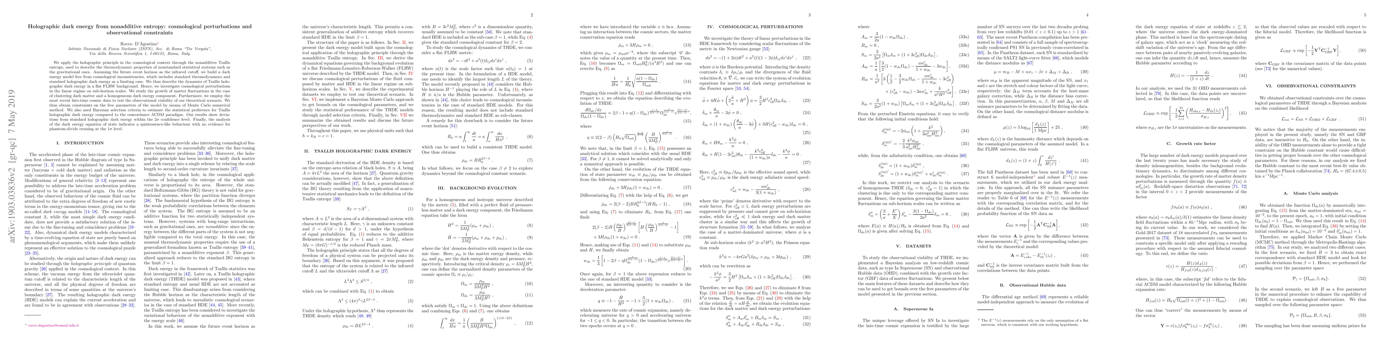 We apply the holographic principle in the cosmological context through the nonadditive Tsallis entropy, used to describe the thermodynamic properties of nonstandard statistical systems such as the gravitational ones. Assuming the future event horizon as the infrared cutoff, we build a dark energy model free from cosmological inconsistencies, which includes standard thermodynamics and standard holographic dark energy as a limiting case. We thus describe the dynamics of Tsallis holographic dark energy in a flat FLRW background. Hence, we investigate cosmological perturbations in the linear regime on sub-horizon scales. We study the growth of matter fluctuations in the case of clustering dark matter and a homogeneous dark energy component. Furthermore, we employ the most recent late-time cosmic data to test the observational viability of our theoretical scenario. We thus obtain constraints on the free parameters of the model by means of Monte Carlo numerical method. We also used Bayesian selection criteria to estimate the statistical preference for Tsallis holographic dark energy compared to the concordance $\Lambda$CDM paradigm. Our results show deviations from standard holographic dark energy within the $2\sigma$ confidence level. Finally, the analysis of the dark energy equation of state indicates a quintessence-like behaviour with no evidence for phantom-divide crossing at the $1\sigma$ level.