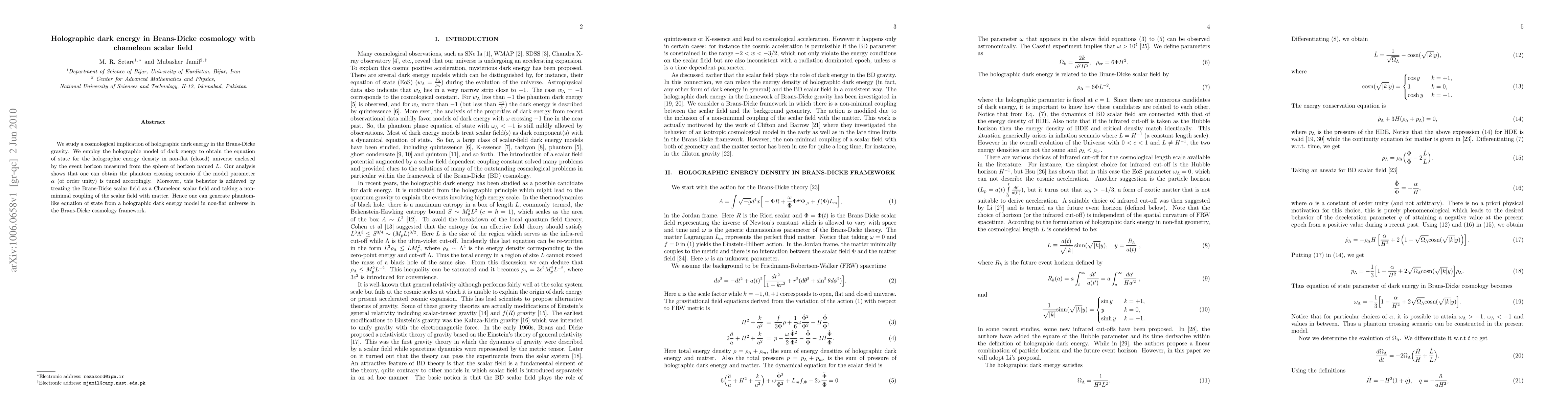 This paper explores holographic dark energy within Brans-Dicke cosmology, utilizing a Chameleon scalar field and non-minimal coupling. The study reveals that phantom crossing can occur when the model parameter α is appropriately tuned, indicating the potential for a phantom-like equation of state in a non-flat universe.