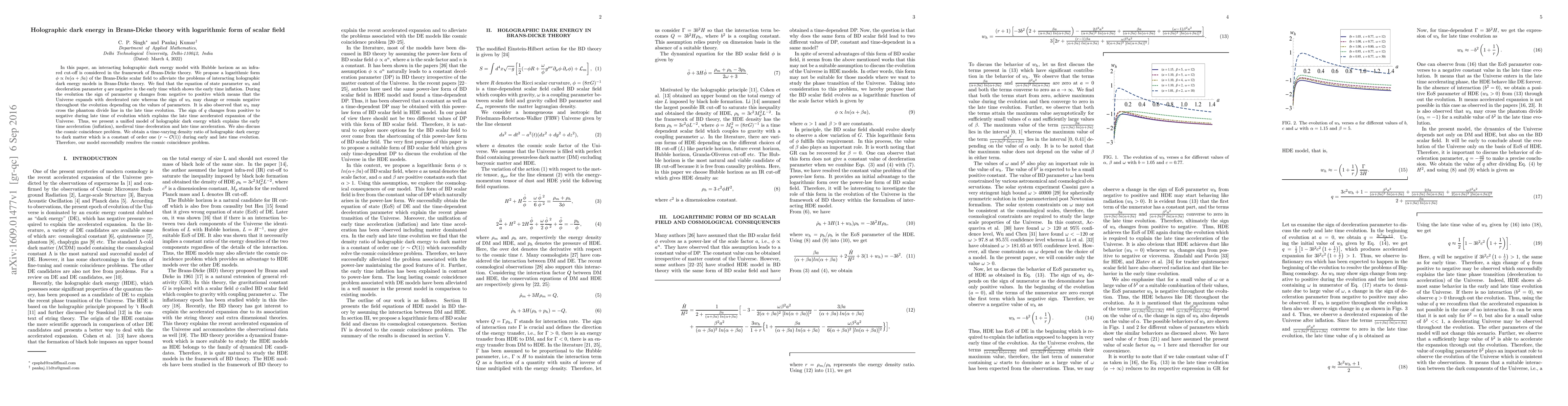This paper proposes a holographic dark energy model in Brans-Dicke theory with a logarithmic scalar field form to address issues in existing models. The model explains early inflation, medieval deceleration, and late-time accelerated expansion, while resolving the cosmic coincidence problem.