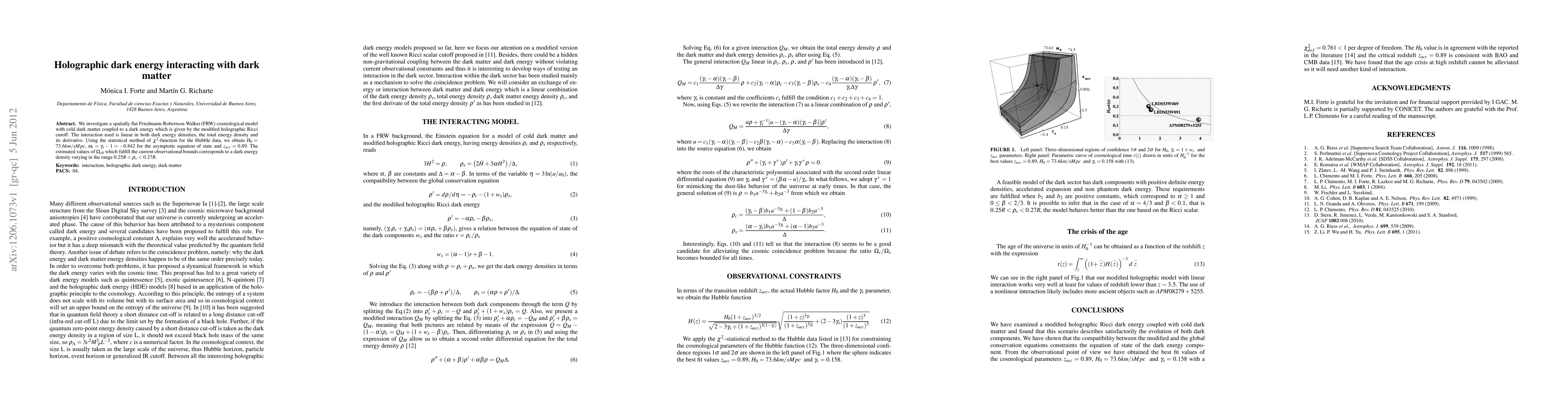 This paper explores a cosmological model where cold dark matter interacts with holographic dark energy defined by a modified holographic Ricci cutoff. The interaction is linear, and the model's parameters are constrained using Hubble data, yielding $H_0=73.6$ km/s/Mpc, and a dark energy density range of $0.25R < \ro_x < 0.27R$.