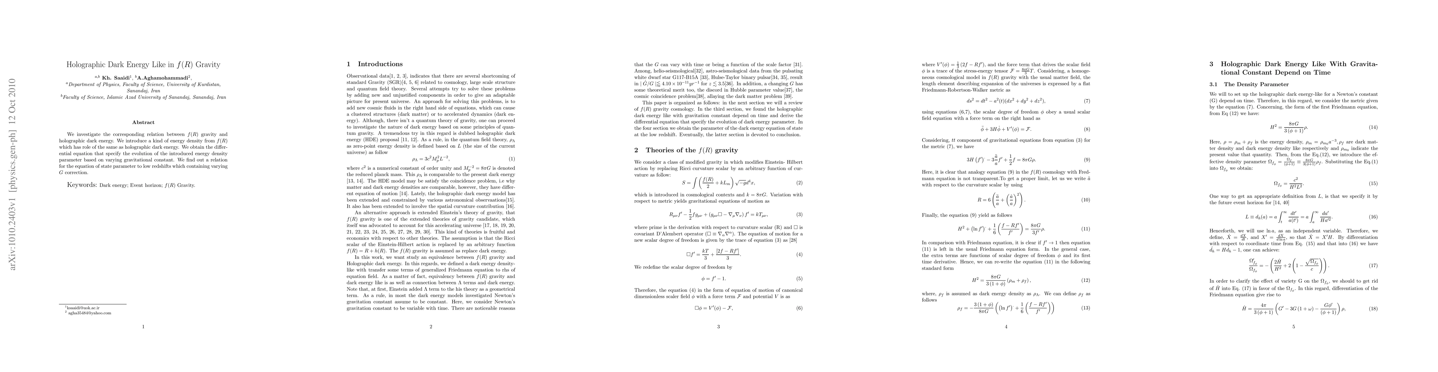 The development of a new energy density parameter from f(R) gravity that exhibits holographic dark energy-like behavior.