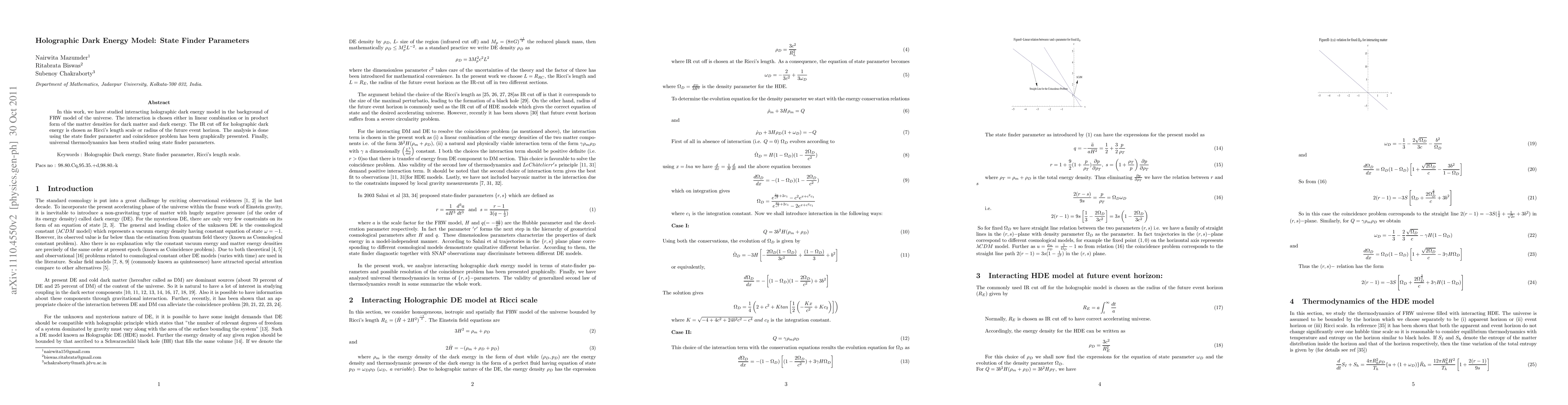 In this work, we have studied interacting holographic dark energy model in the background of FRW model of the universe. The interaction is chosen either in linear combination or in product form of the matter densities for dark matter and dark energy. The IR cut off for holographic dark energy is chosen as Ricci's length scale or radius of the future event horizon. The analysis is done using the state finder parameter and coincidence problem has been graphically presented. Finally, universal thermodynamics has been studied using state finder parameters.