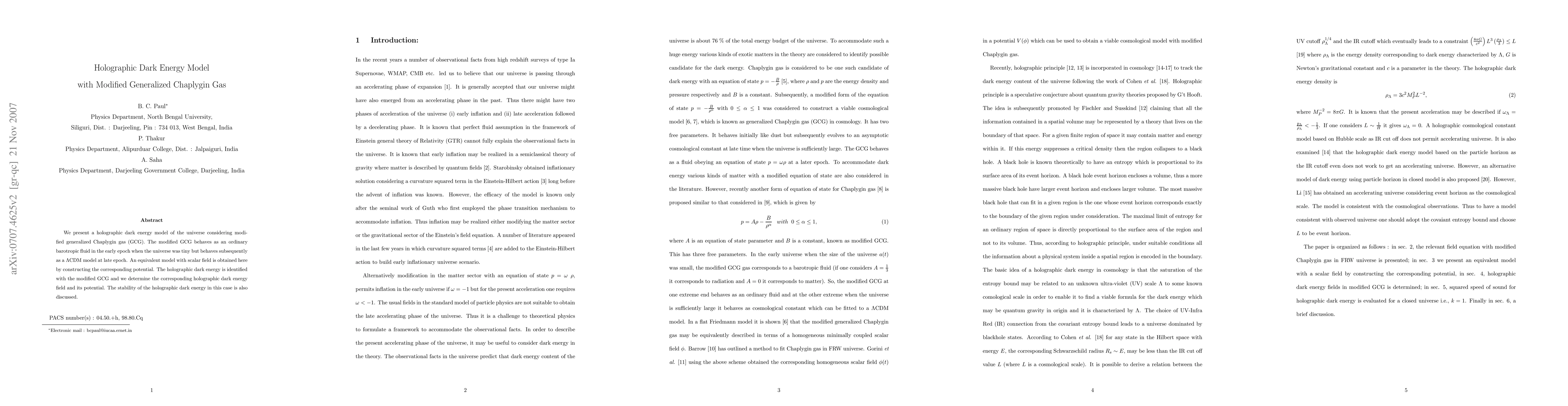 This paper explores a holographic dark energy model using a modified generalized Chaplygin gas, transitioning from an early barotropic fluid to a late-time $\Lambda$CDM model, and derives the corresponding scalar field potential and stability of holographic dark energy.