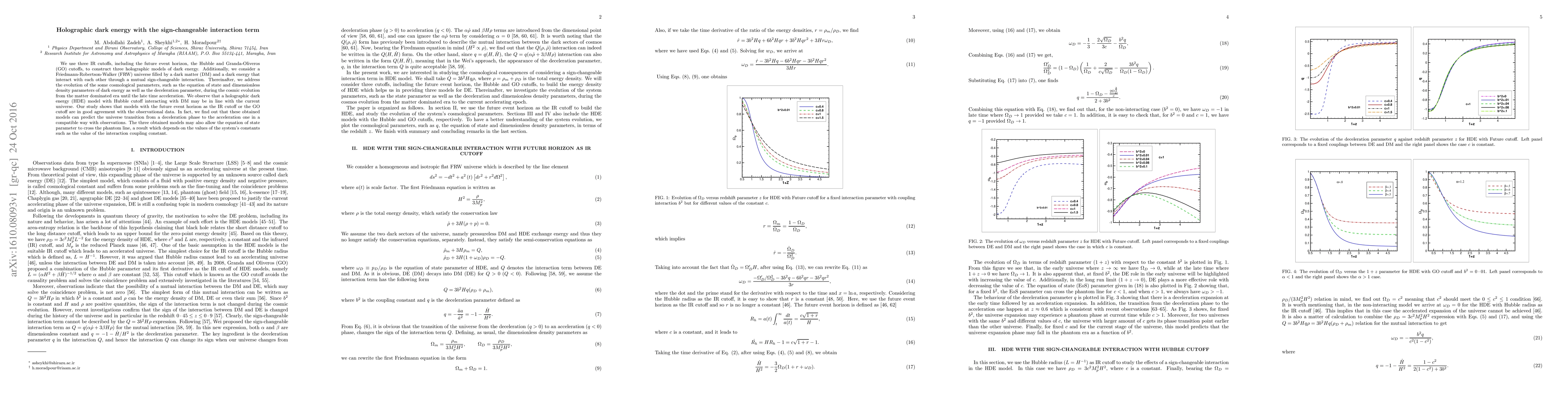 We use three IR cutoffs, including the future event horizon, the Hubble and Granda-Oliveros (GO) cutoffs, to construct three holographic models of dark energy. Additionally, we consider a Friedmann-Robertson-Walker (FRW) universe filled by a dark matter (DM) and a dark energy that interact with each other through a mutual sign-changeable interaction. Thereinafter, we address the evolution of the some cosmological parameters, such as the equation of state and dimensionless density parameters of dark energy as well as the deceleration parameter, during the cosmic evolution from the matter dominated era until the late time acceleration. We observe that a holographic dark energy (HDE) model with Hubble cutoff interacting with DM may be in line with the current universe. Our study shows that models with the future event horizon as the IR cutoff or the GO cutoff are in good agreement with the observational data. In fact, we find out that these obtained models can predict the universe transition from a deceleration phase to the acceleration one in a compatible way with observations. The three obtained models may also allow the equation of state parameter to cross the phantom line, a result which depends on the values of the system's constants such as the value of the interaction coupling constant.