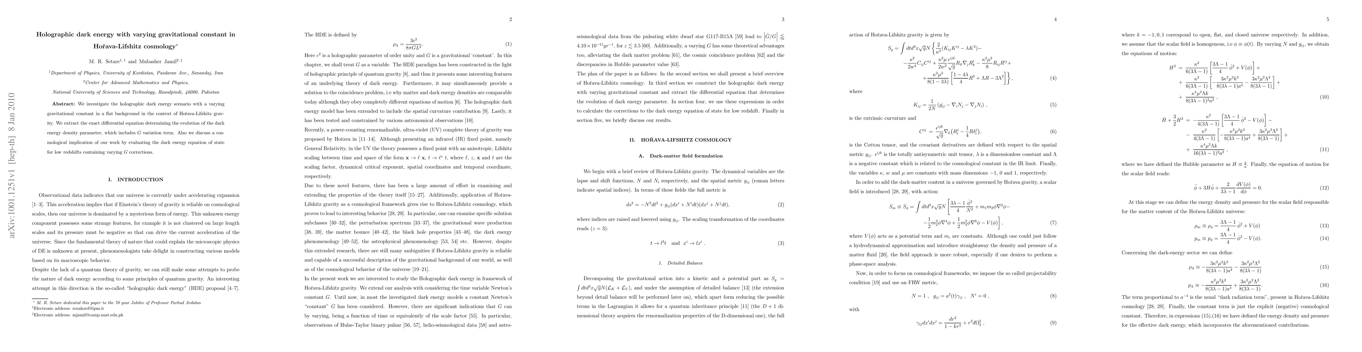 This paper explores holographic dark energy in Horava-Lifshitz cosmology with a varying gravitational constant, deriving an exact differential equation for the dark energy density parameter. It also examines the cosmological implications by evaluating the dark energy equation of state for low redshifts, incorporating corrections from varying $G$.