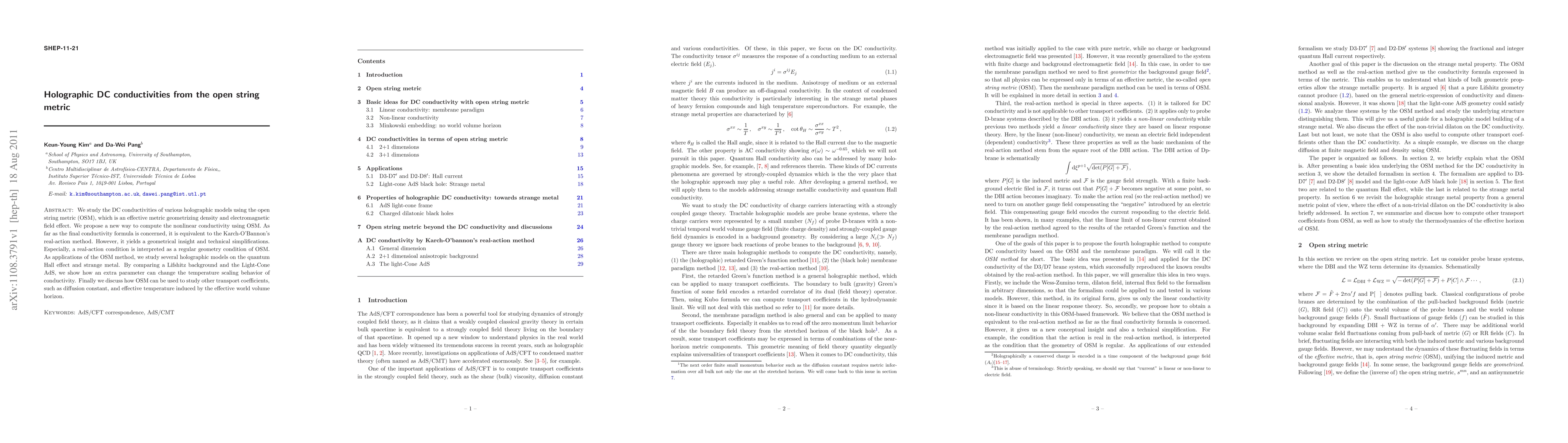 This research introduces the Open String Metric (OSM) to compute DC conductivities in holographic models, offering a geometrical insight and technical simplifications. It demonstrates applications in quantum Hall effect and strange metal studies, showing how an extra parameter alters conductivity's temperature scaling behavior, and hints at potential use in calculating other transport coefficients.