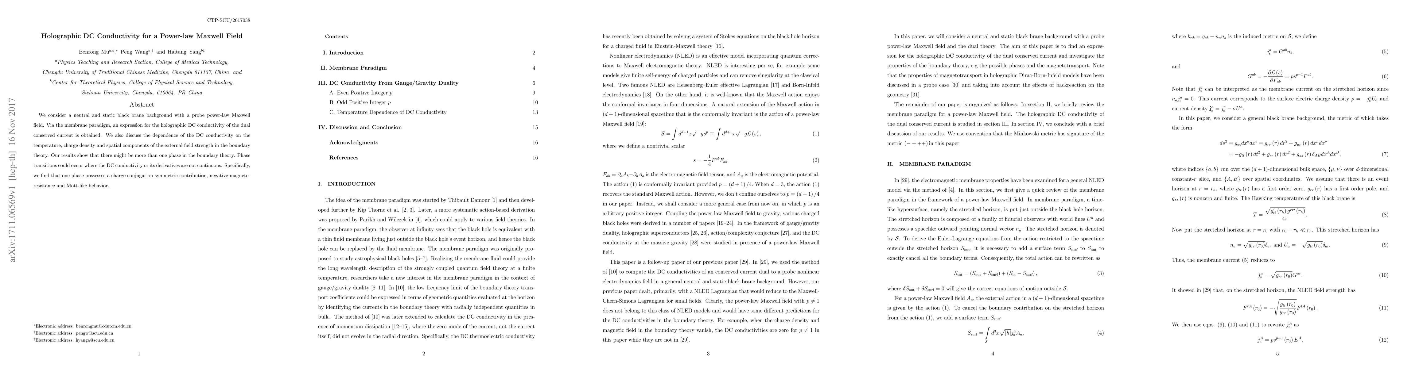 This paper investigates the holographic DC conductivity in a neutral black brane background with a power-law Maxwell field, revealing multiple phases in the boundary theory. The study finds phase transitions with non-continuous DC conductivity, including a phase with charge-conjugation symmetry, negative magneto-resistance, and Mott-like behavior.