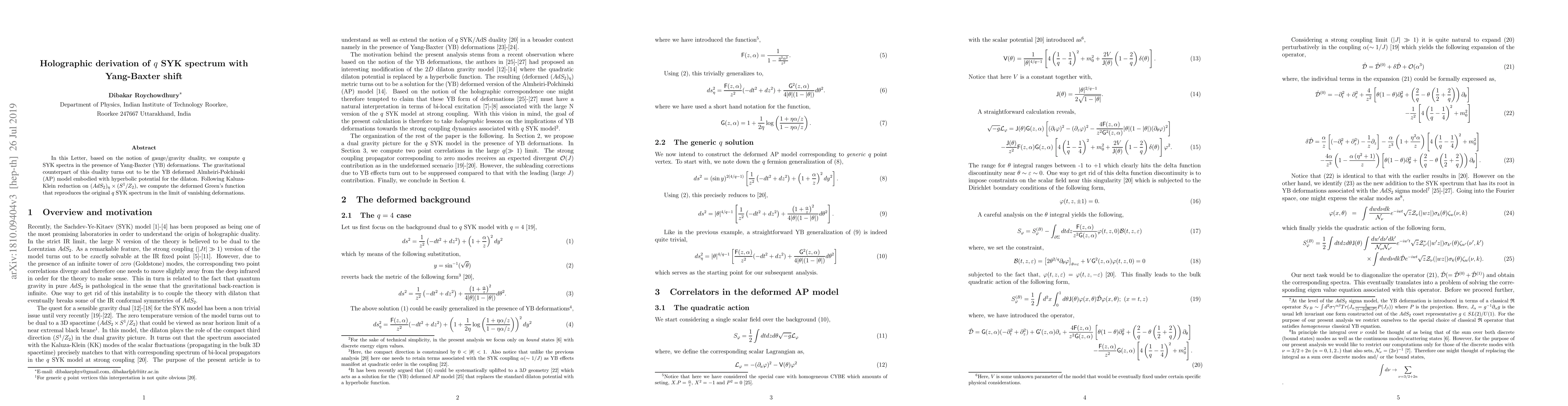 In this Letter, based on the notion of gauge/gravity duality, we compute $ q $ SYK spectra in the presence of Yang-Baxter (YB) deformations. The gravitational counterpart of this duality turns out to be the YB deformed Almheiri-Polchinski (AP) model embodied with hyperbolic potential for the dilaton. Following Kaluza-Klein reduction on $ (AdS_2)_{\eta}\times (S^1/ Z_2) $, we compute the deformed Green's function that reproduces the original $ q $ SYK spectrum in the limit of vanishing deformations.