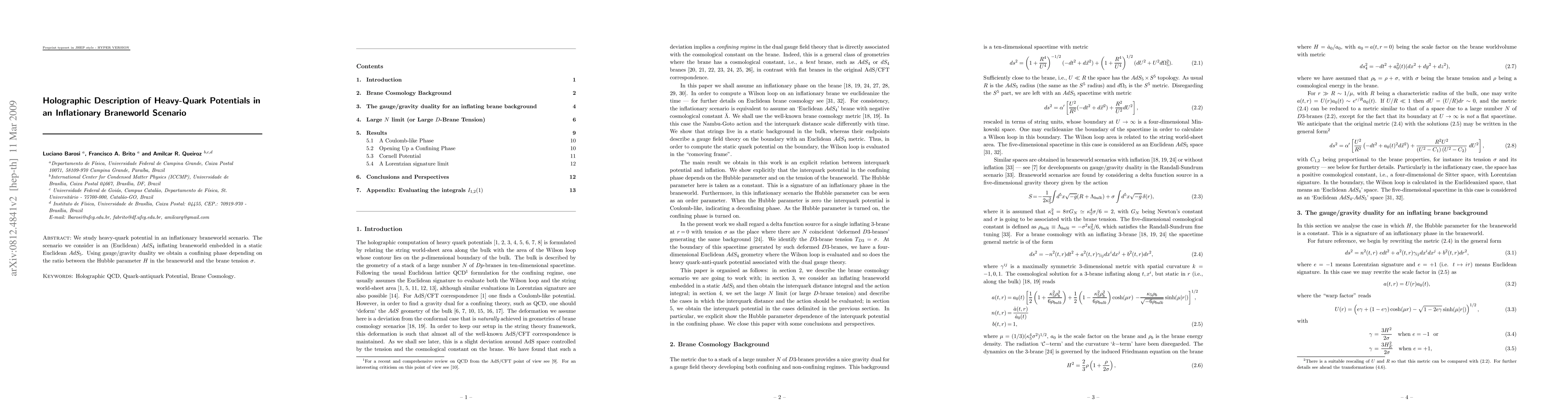 This paper investigates the heavy-quark potential within an inflationary braneworld model, specifically an $AdS_4$ brane in a static $AdS_5$ bulk, using gauge/gravity duality. It reveals a confining phase influenced by the ratio of the braneworld's Hubble parameter to its tension.