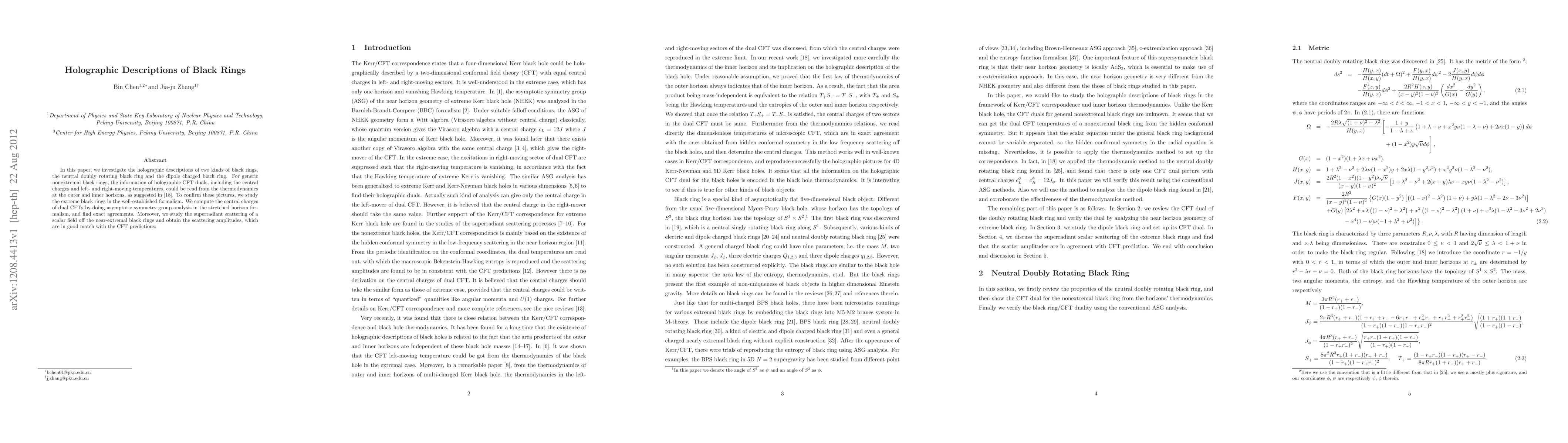 In this paper, we investigate the holographic descriptions of two kinds of black rings, the neutral doubly rotating black ring and the dipole charged black ring. For generic nonextremal black rings, the information of holographic CFT duals, including the central charges and left- and right-moving temperatures, could be read from the thermodynamics at the outer and inner horizons, as suggested in arXiv:1206.2015. To confirm these pictures, we study the extreme black rings in the well-established formalism. We compute the central charges of dual CFTs by doing asymptotic symmetry group analysis in the stretched horizon formalism, and find exact agreements. Moreover, we study the superradiant scattering of a scalar field off the near-extremal black rings and obtain the scattering amplitudes, which are in good match with the CFT predictions.