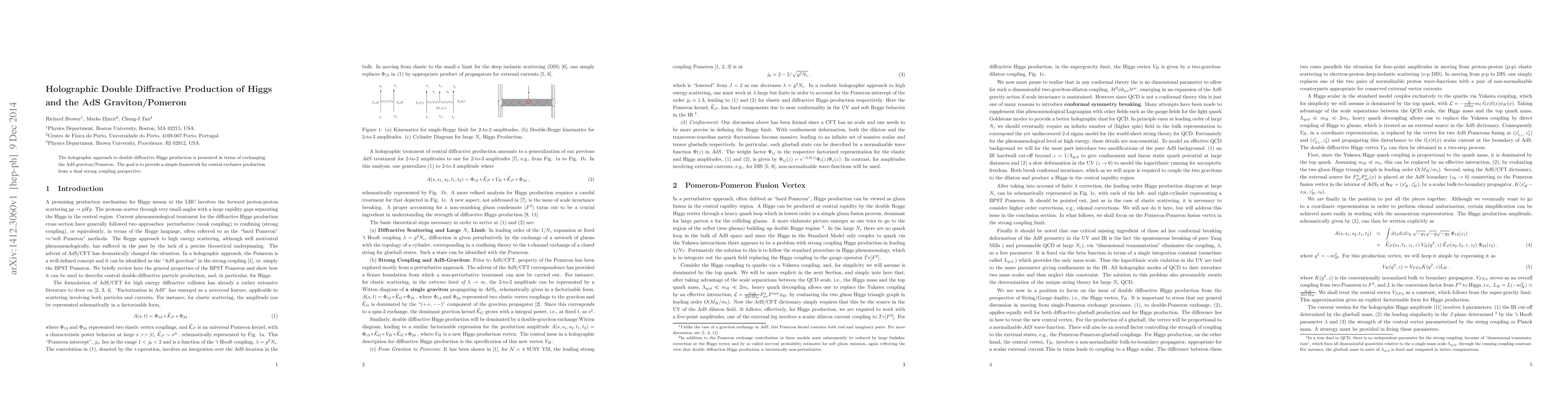 The holographic approach to double diffractive Higgs production is presented in terms of exchanging the AdS graviton/Pomeron. The goal is to provide a simple framework for central exclusive production from a dual strong coupling perspective.
