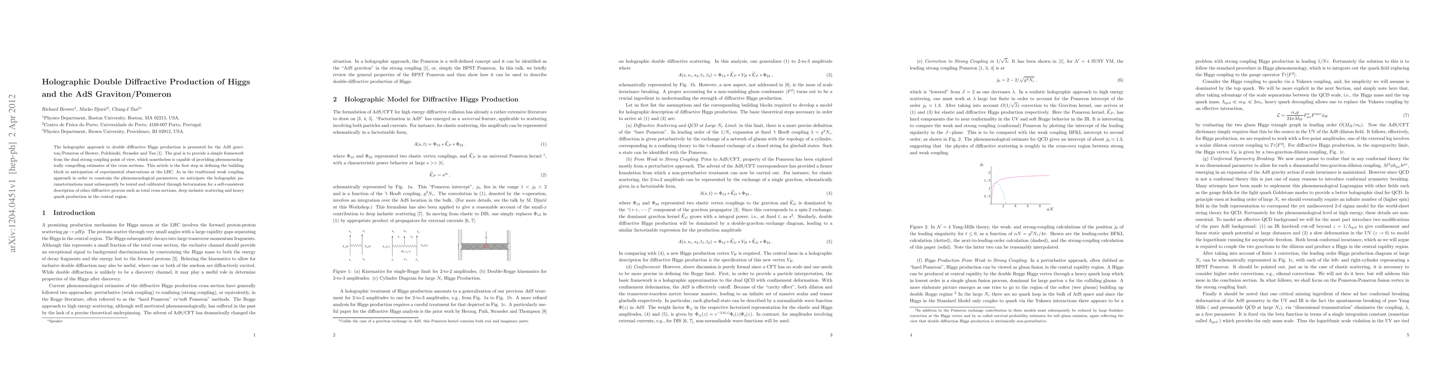This paper introduces a holographic method for double diffractive Higgs production using the AdS graviton/Pomeron, aiming to predict QCD's strong coupling expansion. It sets the stage for future LHC experiments by comparing this approach with traditional weak coupling BFKL and Regge models.