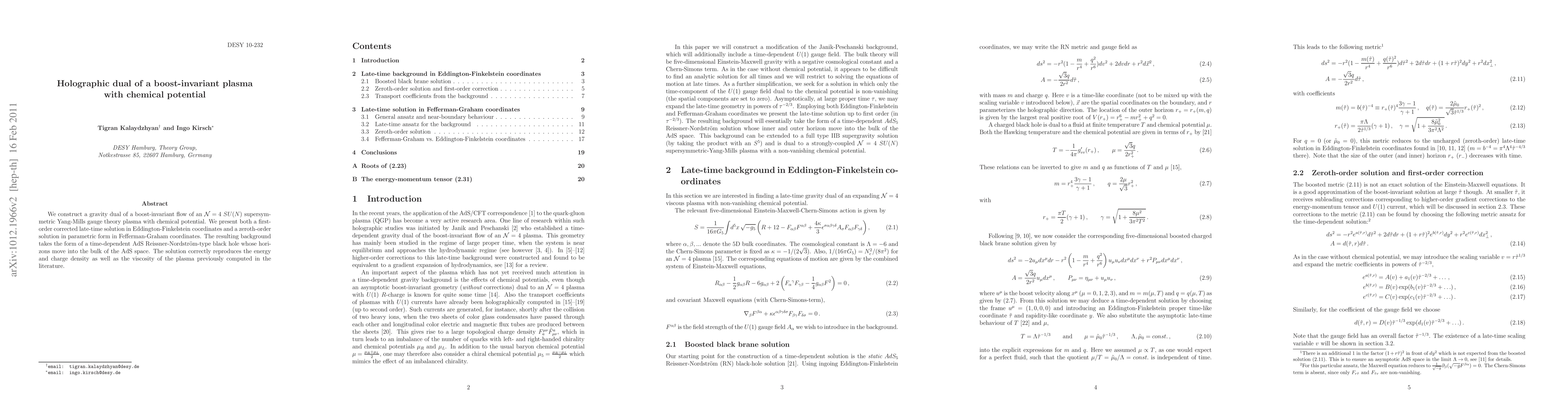 The paper presents a gravity dual for a boost-invariant flow of a chemically-charged N=4 SU(N) supersymmetric Yang-Mills plasma, providing both first-order and zeroth-order solutions. The results accurately reproduce known energy, charge density, and viscosity values.