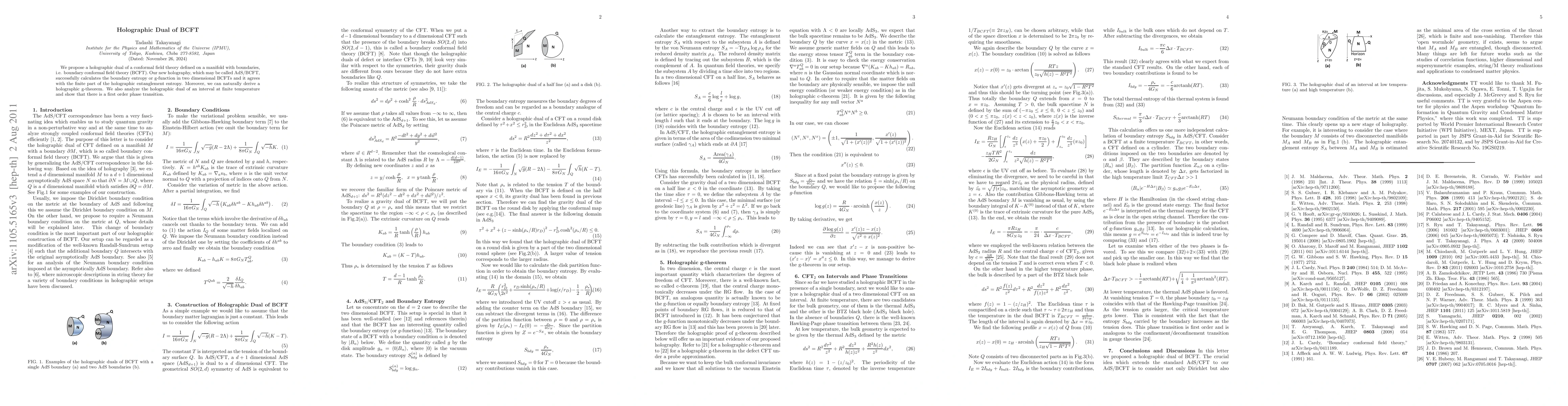 This paper proposes a holographic dual, termed AdS/BCFT, for boundary conformal field theories (BCFTs), successfully calculating boundary entropy and deriving a holographic g-theorem. It also demonstrates a first-order phase transition in the holographic dual of a finite-temperature interval.