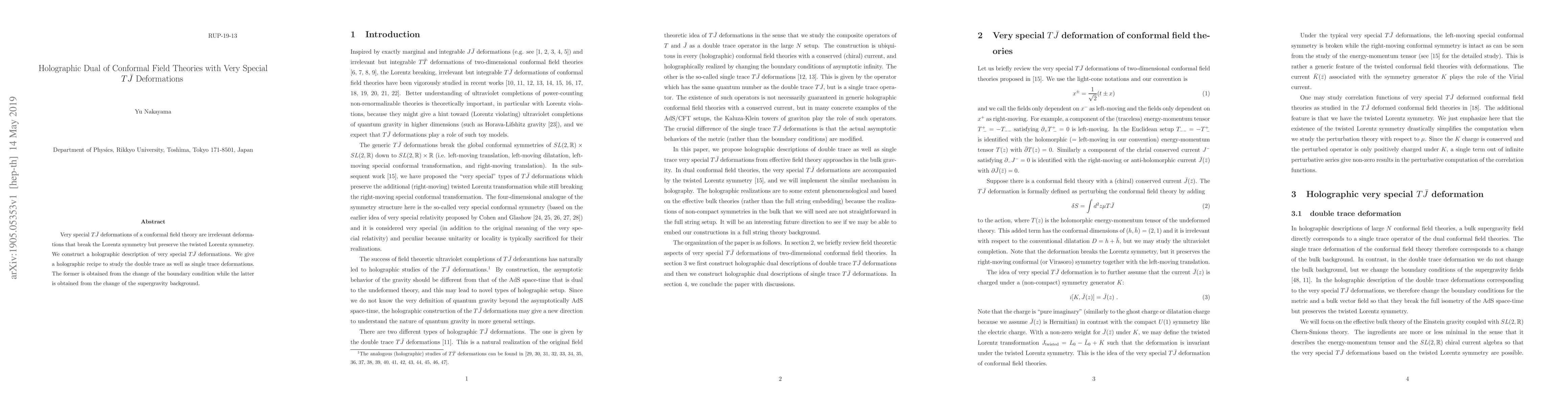 This paper constructs a holographic description for very special $T\bar{J}$ deformations of conformal field theories, which break Lorentz symmetry but preserve twisted Lorentz symmetry. It provides a method to study both double trace and single trace deformations using changes in boundary conditions and supergravity backgrounds respectively.