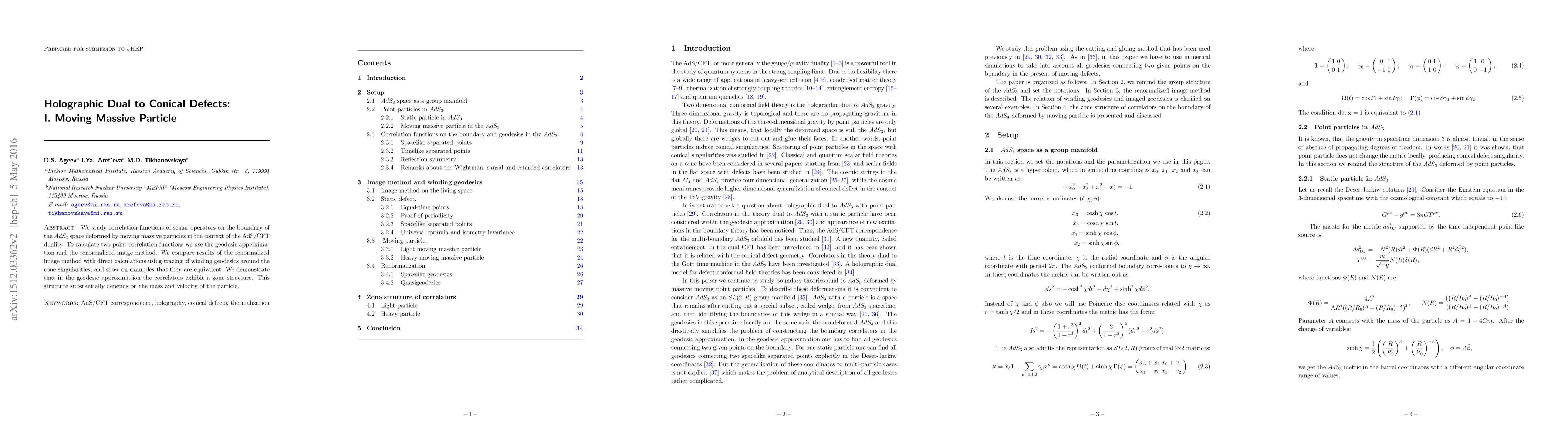 We study correlation functions of scalar operators on the boundary of the $AdS_3$ space deformed by moving massive particles in the context of the AdS/CFT duality. To calculate two-point correlation functions we use the geodesic approximation and the renormalized image method. We compare results of the renormalized image method with direct calculations using tracing of winding geodesics around the cone singularities, and show on examples that they are equivalent. We demonstrate that in the geodesic approximation the correlators exhibit a zone structure. This structure substantially depends on the mass and velocity of the particle.