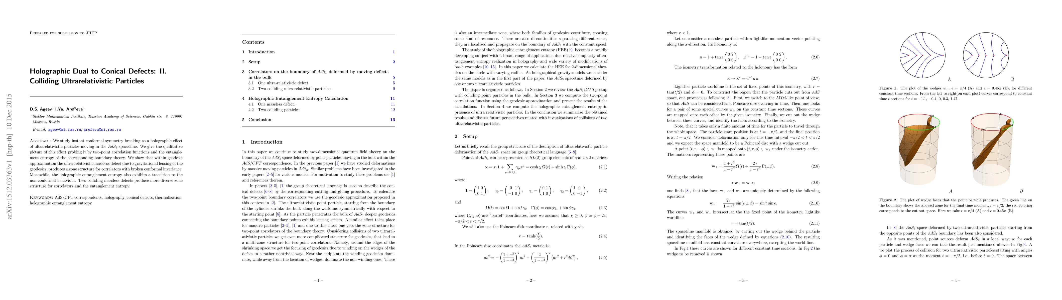 We study instant conformal symmetry breaking as a holographic effect of ultrarelativistic particles moving in the AdS3 spacetime. We give the qualitative picture of this effect probing it by two-point correlation functions and the entanglement entropy of the corresponding boundary theory. We show that within geodesic approximation the ultra-relativistic massless defect due to gravitational lensing of the geodesics, produces a zone structure for correlators with broken conformal invariance. Meanwhile, the holographic entanglement entropy also exhibits a transition to the non-conformal behaviour. Two colliding massless defects produce more diverse zone structure for correlators and the entanglement entropy.