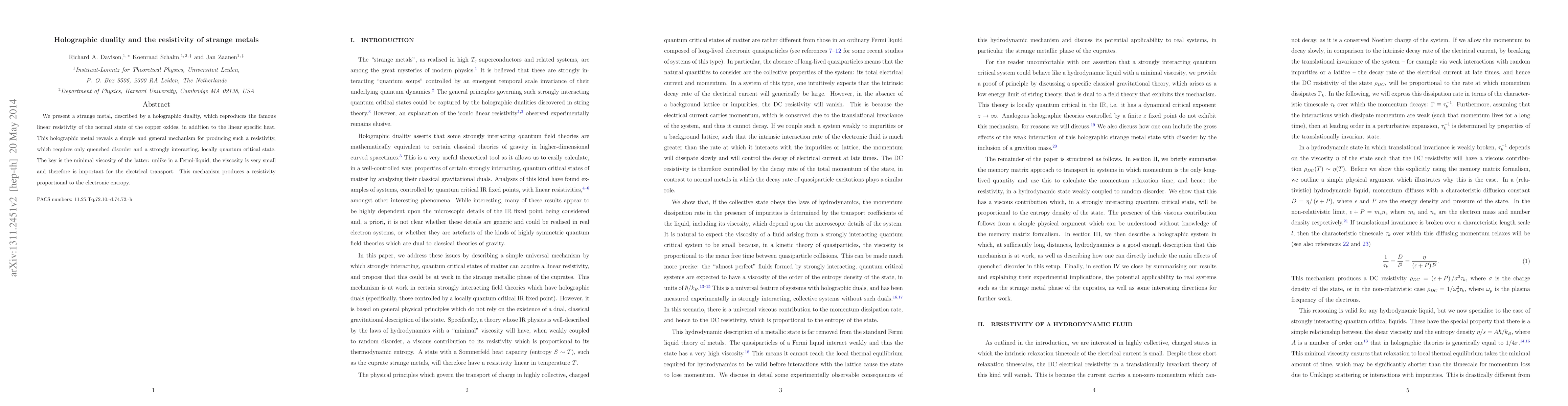 This paper explores a holographic duality model for strange metals, demonstrating how it can reproduce the linear resistivity and specific heat observed in copper oxides. The model attributes this behavior to quenched disorder and a strongly interacting, locally quantum critical state with minimal viscosity, which significantly influences electrical transport.