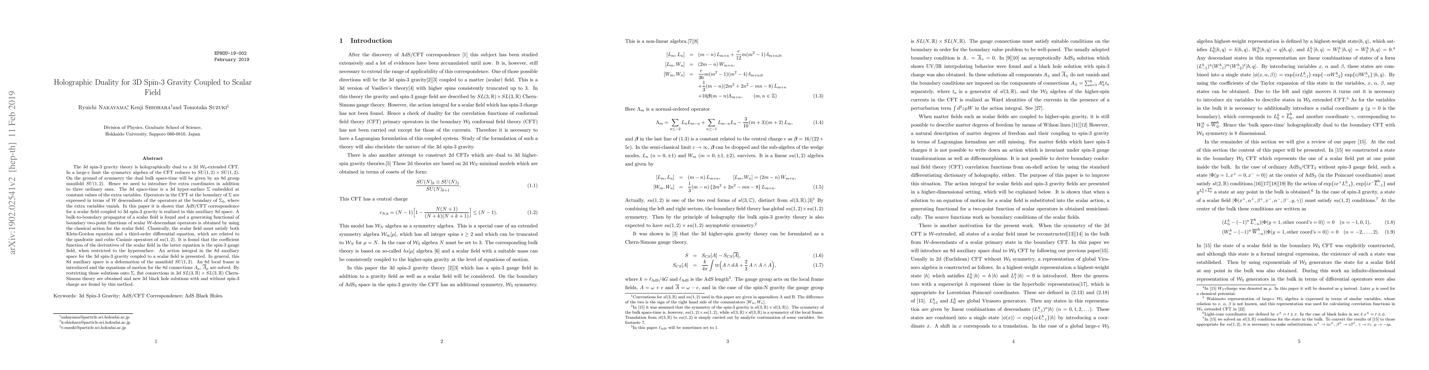 This paper establishes a holographic duality between 3D spin-3 gravity coupled to a scalar field and a 2D ${\cal W}_3$-extended conformal field theory. It introduces an 8D auxiliary space to realize the AdS/CFT correspondence, deriving new 3D black hole solutions with and without spin-3 charge.