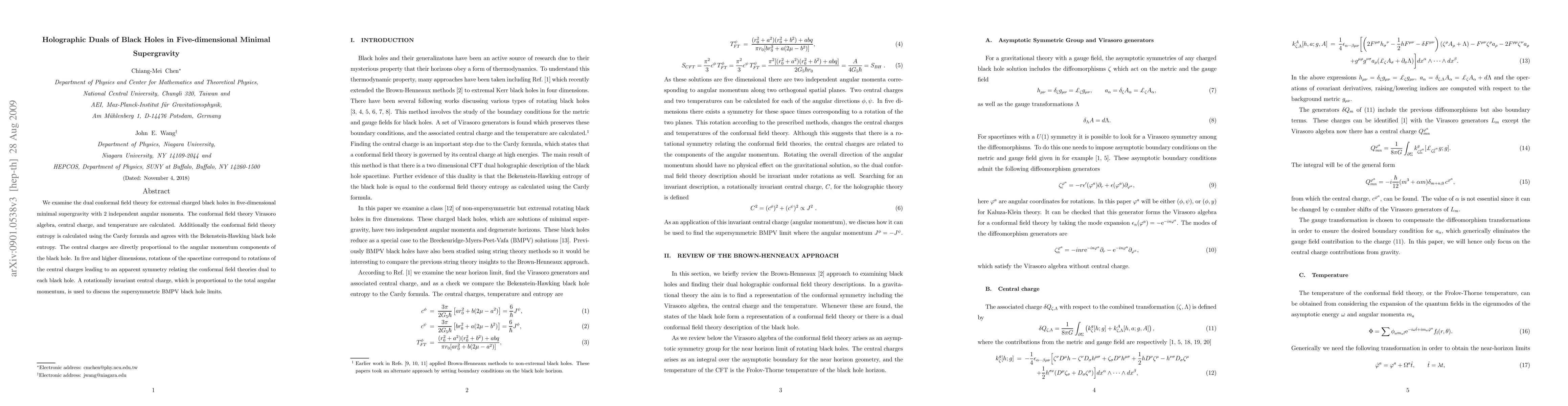 This paper investigates the holographic dual conformal field theory for extremal charged black holes in five-dimensional minimal supergravity, calculating the central charge, temperature, and entropy. The conformal field theory entropy matches the Bekenstein-Hawking black hole entropy, revealing a symmetry relating the dual conformal field theories to black holes through their angular momenta.