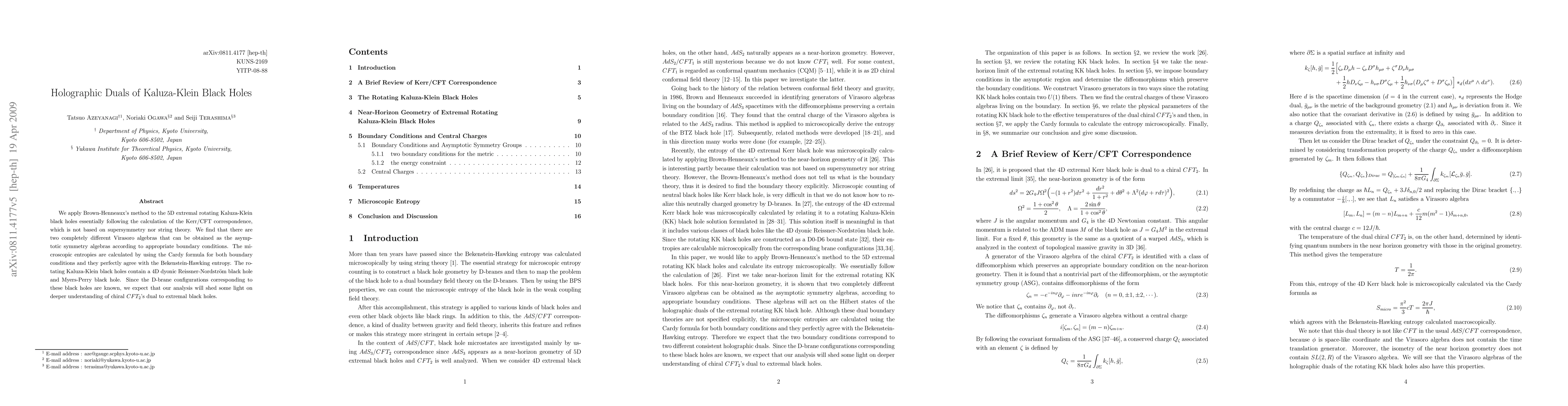 We apply Brown-Henneaux's method to the 5D extremal rotating Kaluza-Klein black holes essentially following the calculation of the Kerr/CFT correspondence, which is not based on supersymmetry nor string theory. We find that there are two completely different Virasoro algebras that can be obtained as the asymptotic symmetry algebras according to appropriate boundary conditions. The microscopic entropies are calculated by using the Cardy formula for both boundary conditions and they perfectly agree with the Bekenstein-Hawking entropy. The rotating Kaluza-Klein black holes contain a 4D dyonic Reissner-Nordstrom black hole and Myers-Perry black hole. Since the D-brane configurations corresponding to these black holes are known, we expect that our analysis will shed some light on deeper understanding of chiral CFT2's dual to extremal black holes.