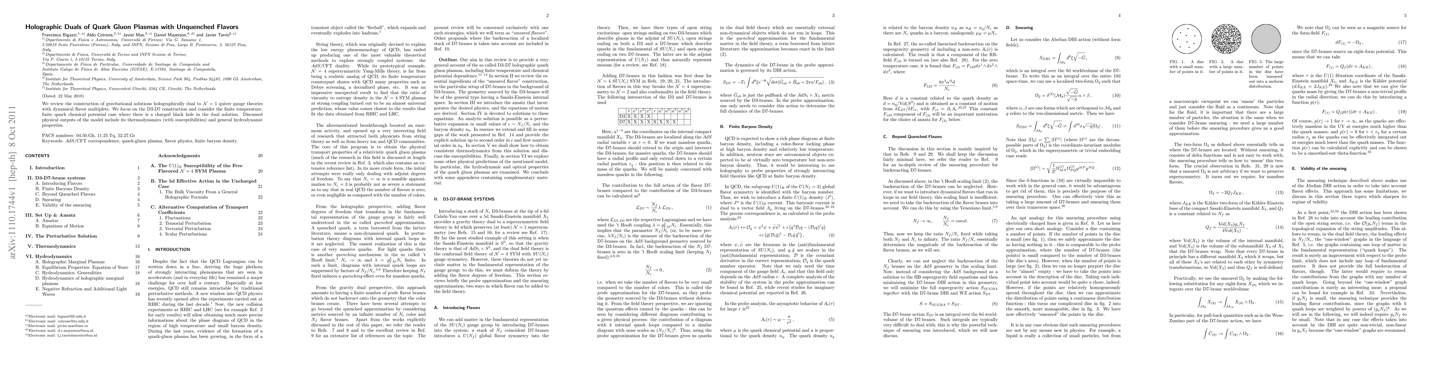 We review the construction of gravitational solutions holographically dual to N=1 quiver gauge theories with dynamical flavor multiplets. We focus on the D3-D7 construction and consider the finite temperature, finite quark chemical potential case where there is a charged black hole in the dual solution. Discussed physical outputs of the model include its thermodynamics (with susceptibilities) and general hydrodynamic properties.