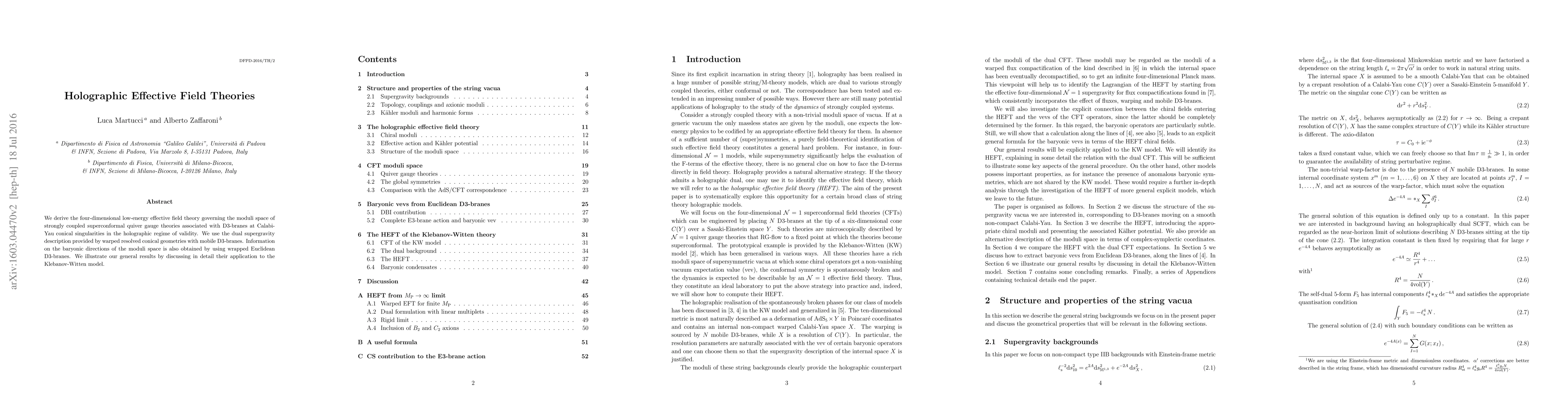 We derive the four-dimensional low-energy effective field theory governing the moduli space of strongly coupled superconformal quiver gauge theories associated with D3-branes at Calabi-Yau conical singularities in the holographic regime of validity. We use the dual supergravity description provided by warped resolved conical geometries with mobile D3-branes. Information on the baryonic directions of the moduli space is also obtained by using wrapped Euclidean D3-branes. We illustrate our general results by discussing in detail their application to the Klebanov-Witten model.